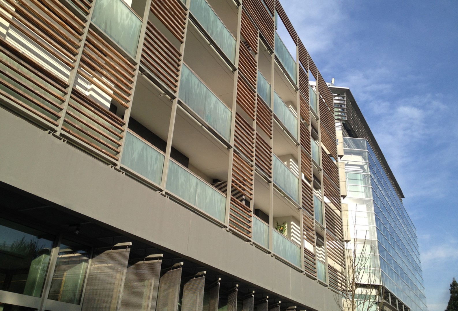 La façade principale du parc est tramée par une large grille métallique, posée en tête des balcons continus, qui reçoit des lames en bois posées à claire voix de manière à ménager des vues et assurer une certaine intimité des logements exposés sur l’espace public. Elle s'anime ainsi d'un jeu d'ombres et de lumières selon les saisons et les instants de la journée. Les façades secondaires opposent à cette esthétique travaillée un dessin plus sobre et minimal.