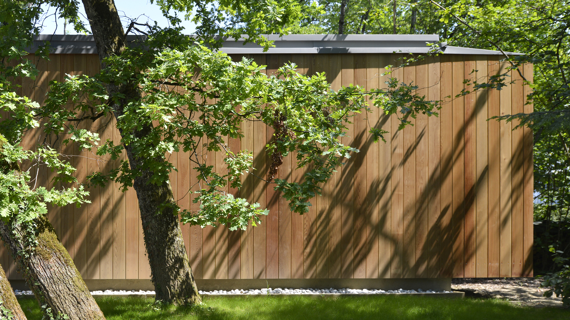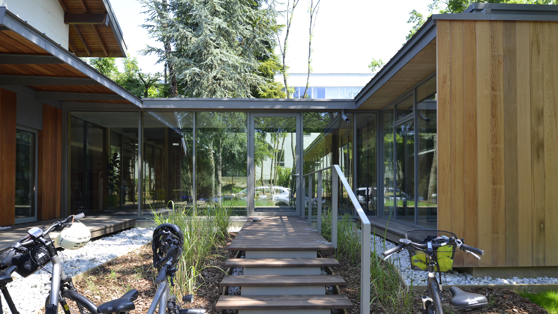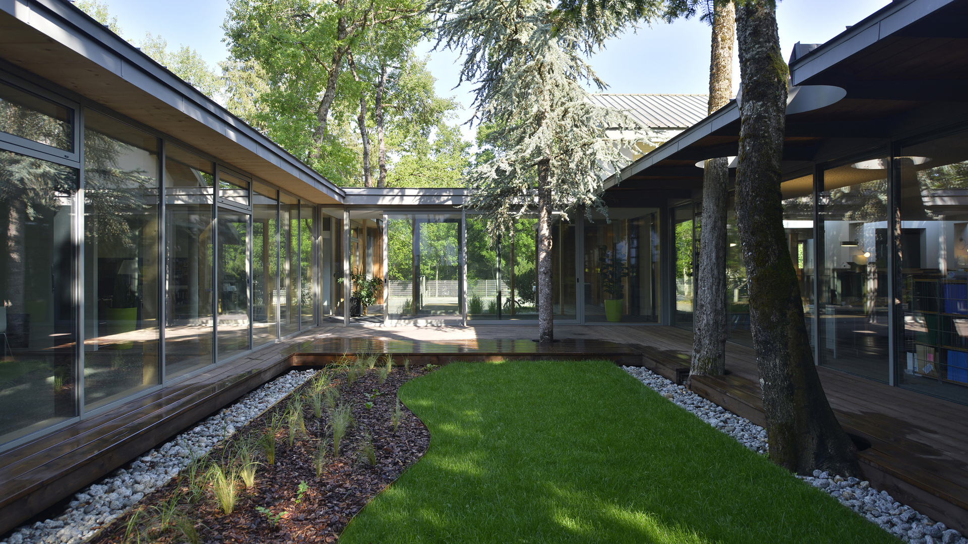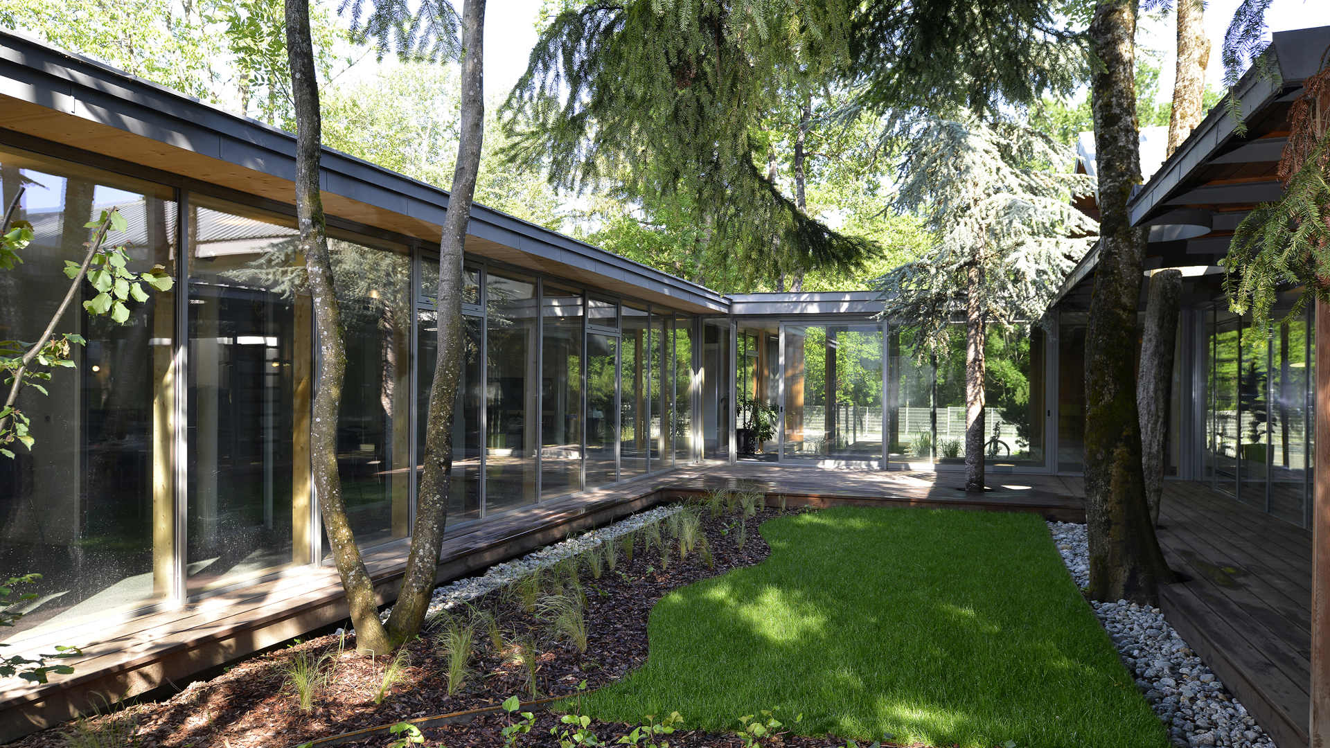 Les espaces au sol sont soit engazonnés, soit laissés naturels à l’état de sous-bois (végétation rase et couvre-sol). Quelques arbustes encadrent les emmarchements de l’entrée. Le projet paysager tend à préserver le caractère naturel du site : ambiance de sous-bois, végétation adaptée au climat, préservation de l’écosystème.