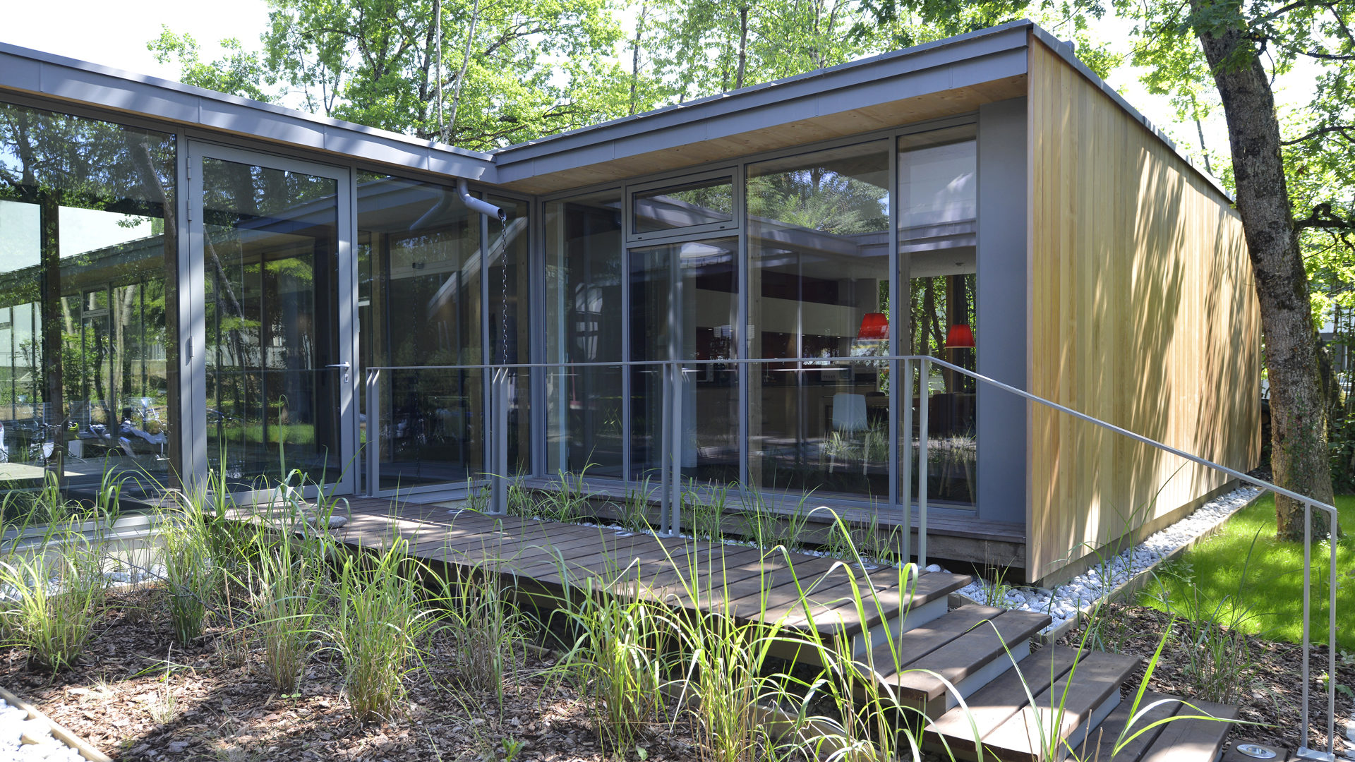 Les espaces entre les stationnements et les bâtiments sont plantés en massif, avec des graminées géantes et des bambous, pour créer un effet de densité.