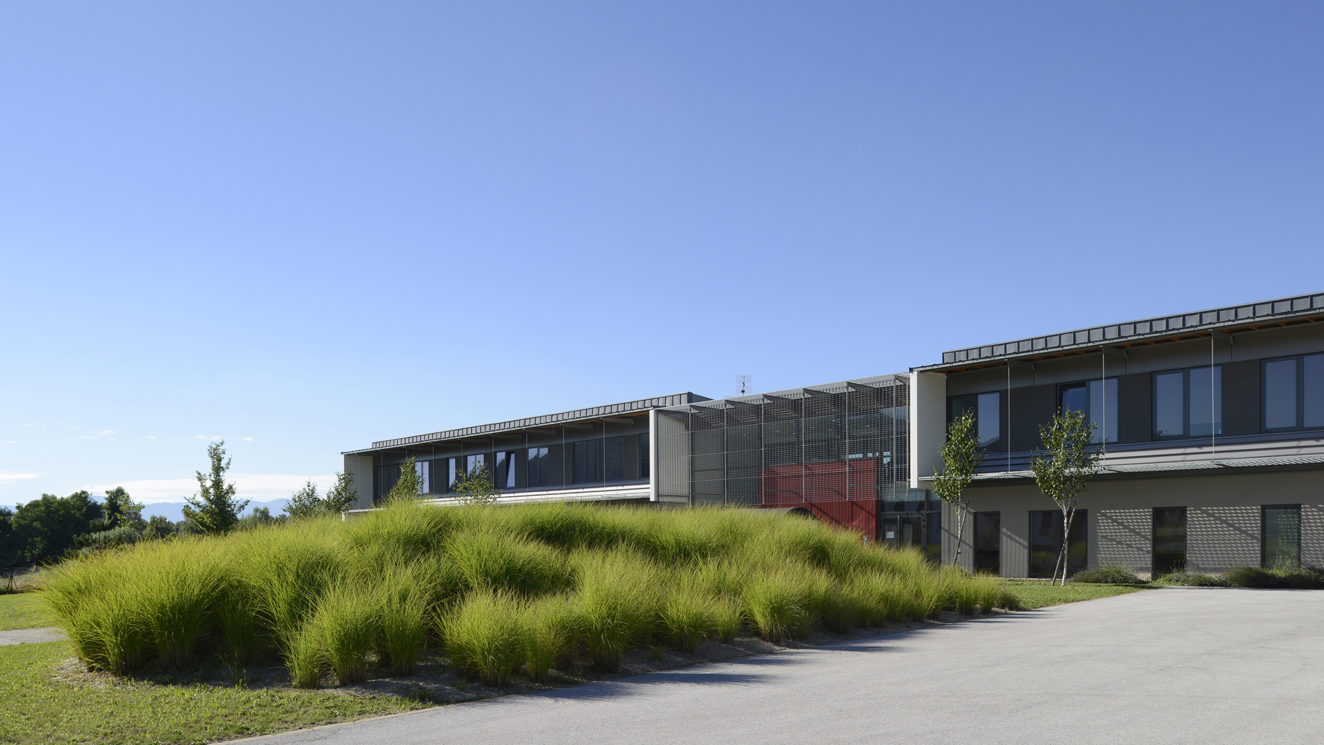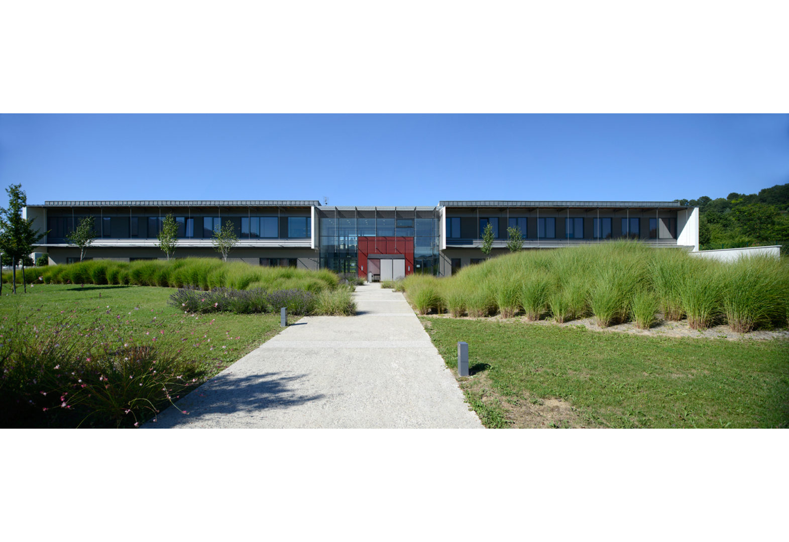 A la frange minérale de l’alignement Est, nous avons souhaité proposer un véritable environnement naturel. Reprenant sans les modifier les courbes du terrain, une alternance de bandes en herbe et en arbres rythment le parc dans lequel s’enfoncent les bâtiments. Les plantations libres et denses des arbres dans des allées couvertes en graminées, créent des écrans visuels entre les deux entités du programme.