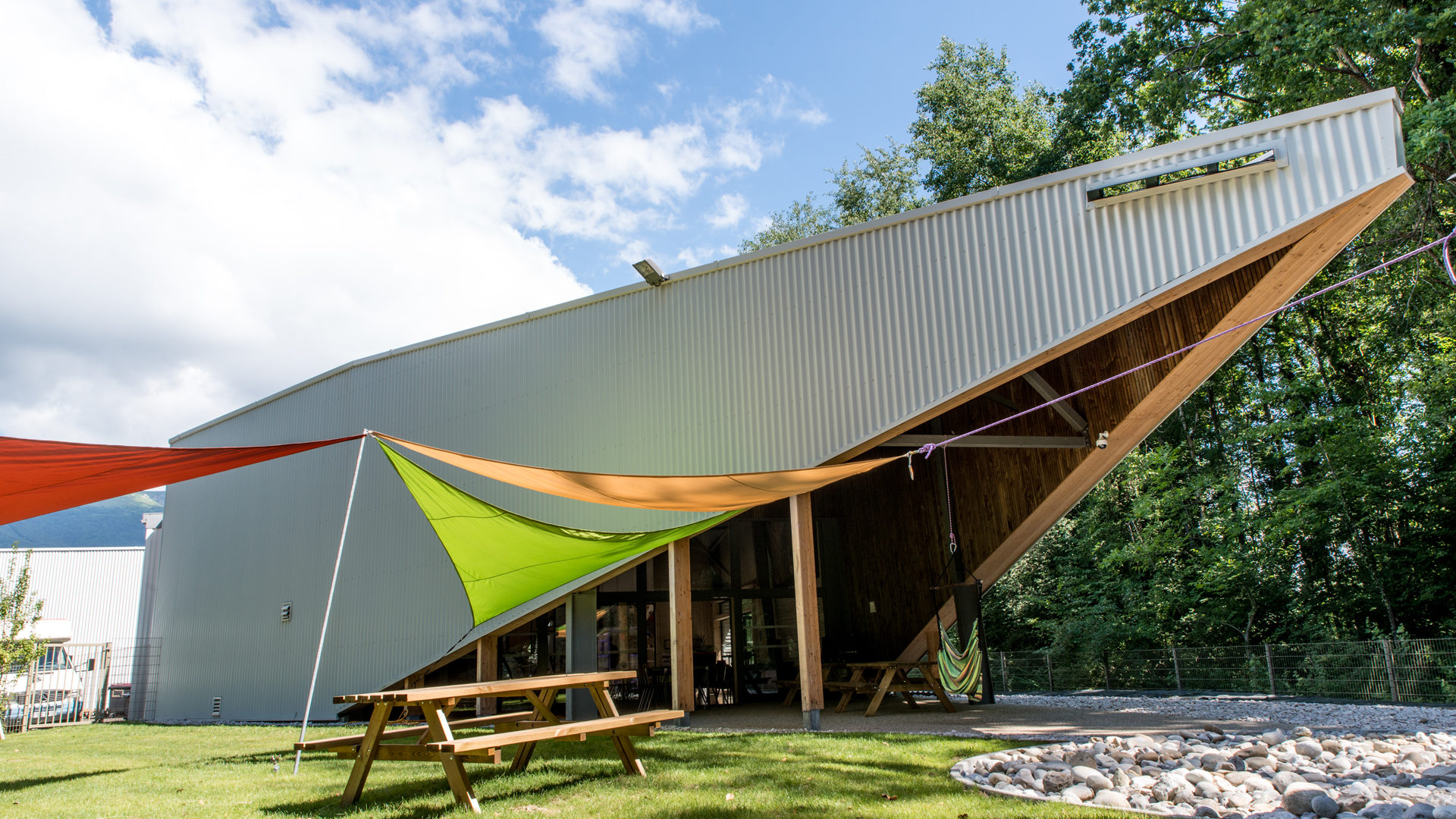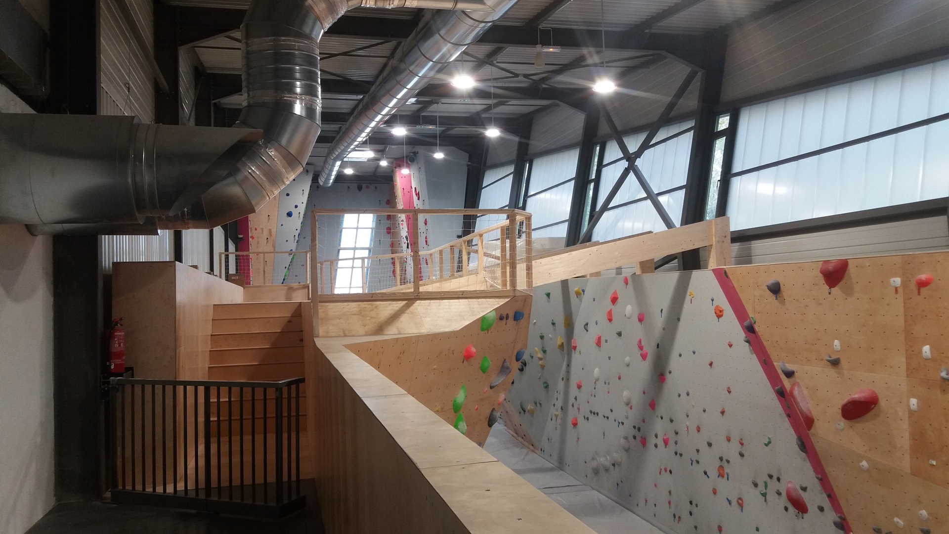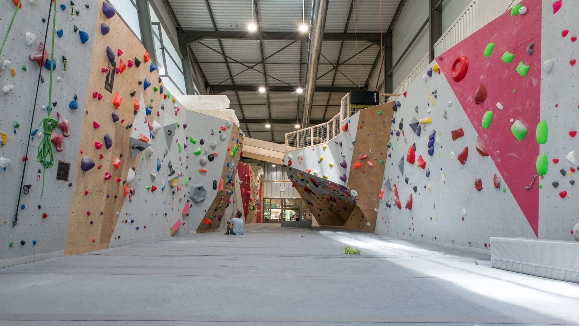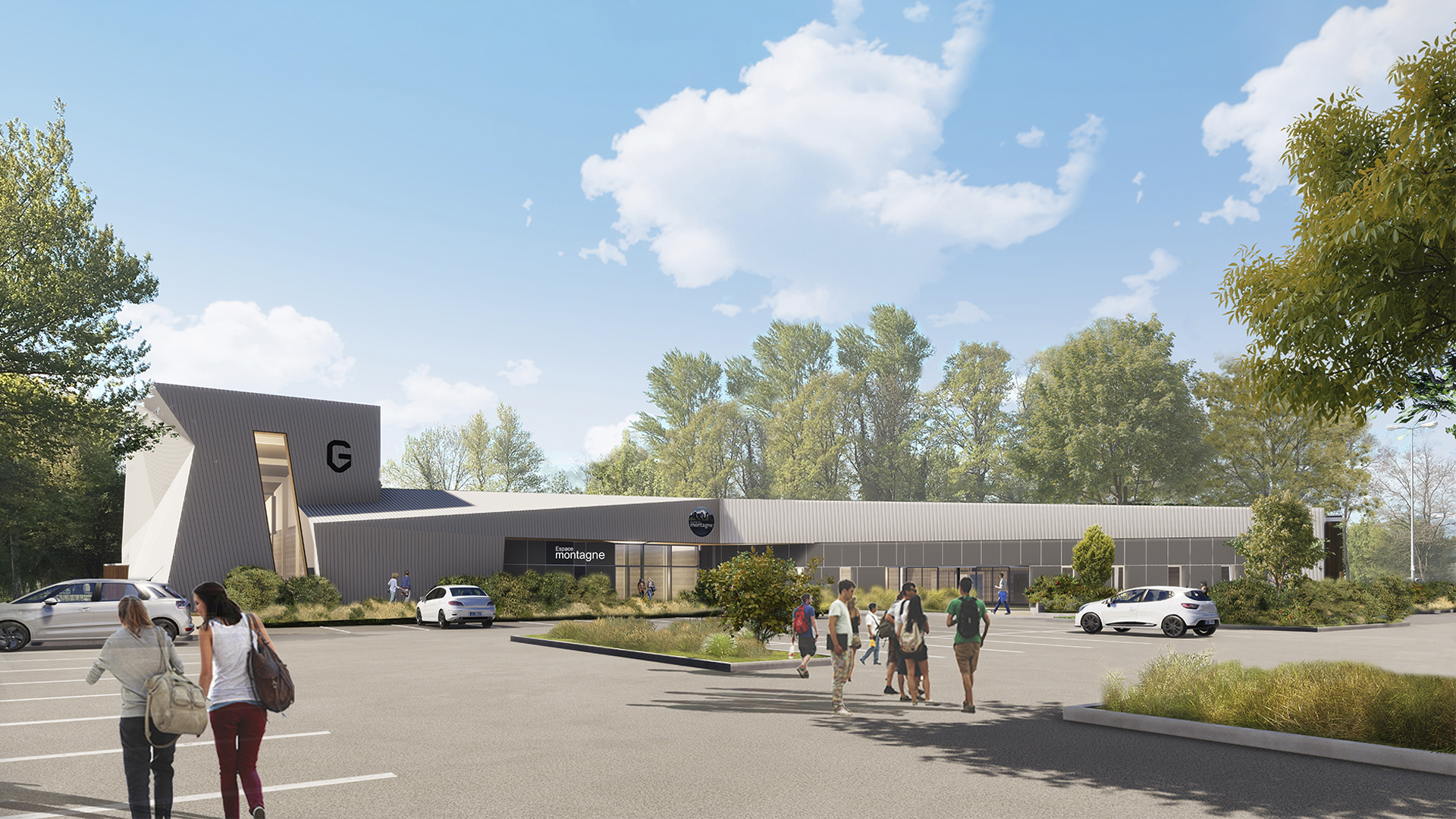 Nous avons voulu une architecture qui intègre toutes ces composantes dans un ensemble bâti homogène, répondant prioritairement aux contraintes fonctionnelles, en les utilisant comme point de départ de l’organisation d’un projet à l’architecture homogène et lisible. Le Cortigrimpe est situé dans le volume le plus haut ; cela permet l’installation des murs d’escalade de différentes hauteurs. La façade Est, traitée en creux, permet d’appuyer directement les murs de blocs sur cette forme. A l’extrémité sud, le bâtiment se termine en pointe et accueille à cet endroit une terrasse couverte.