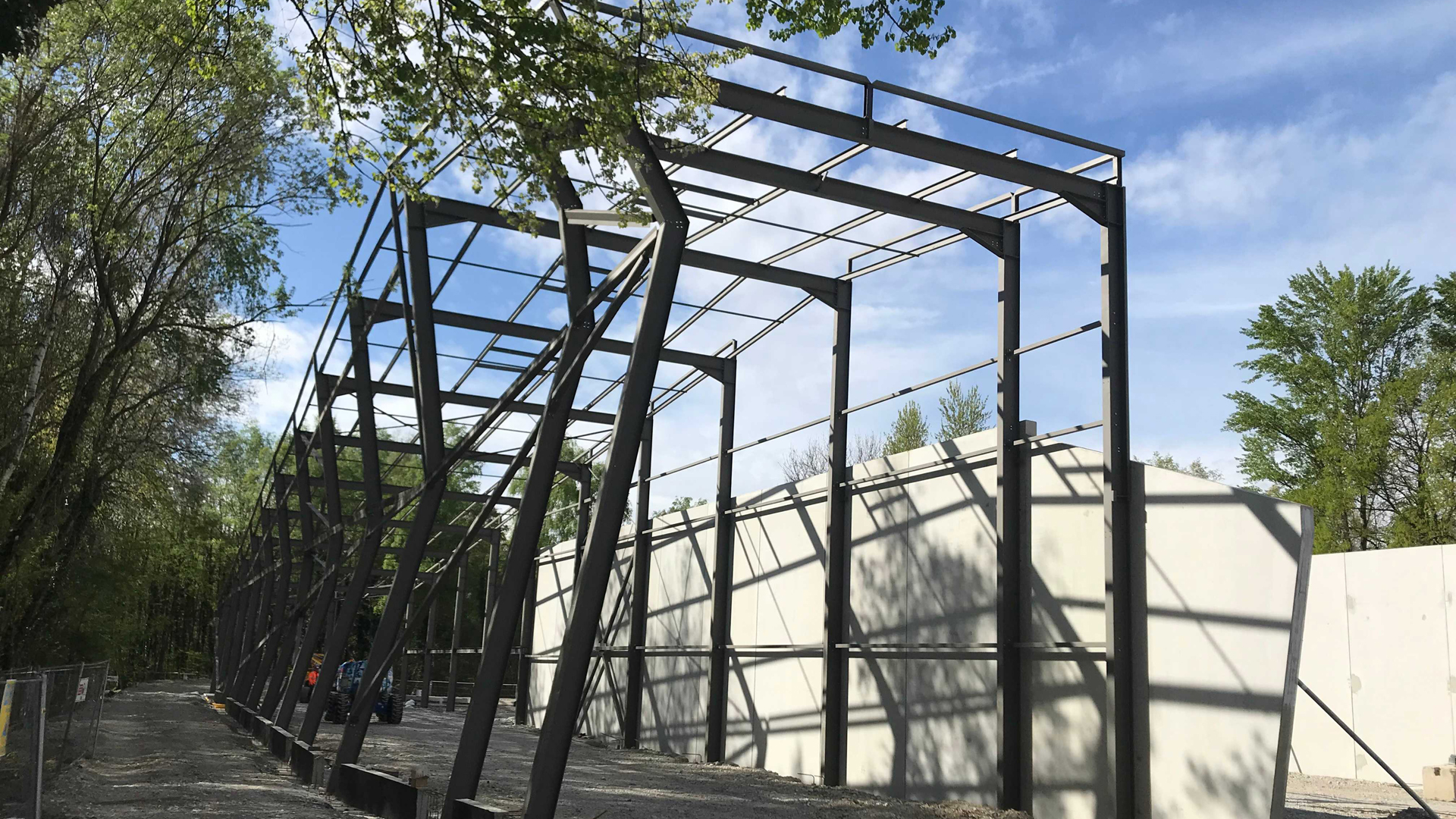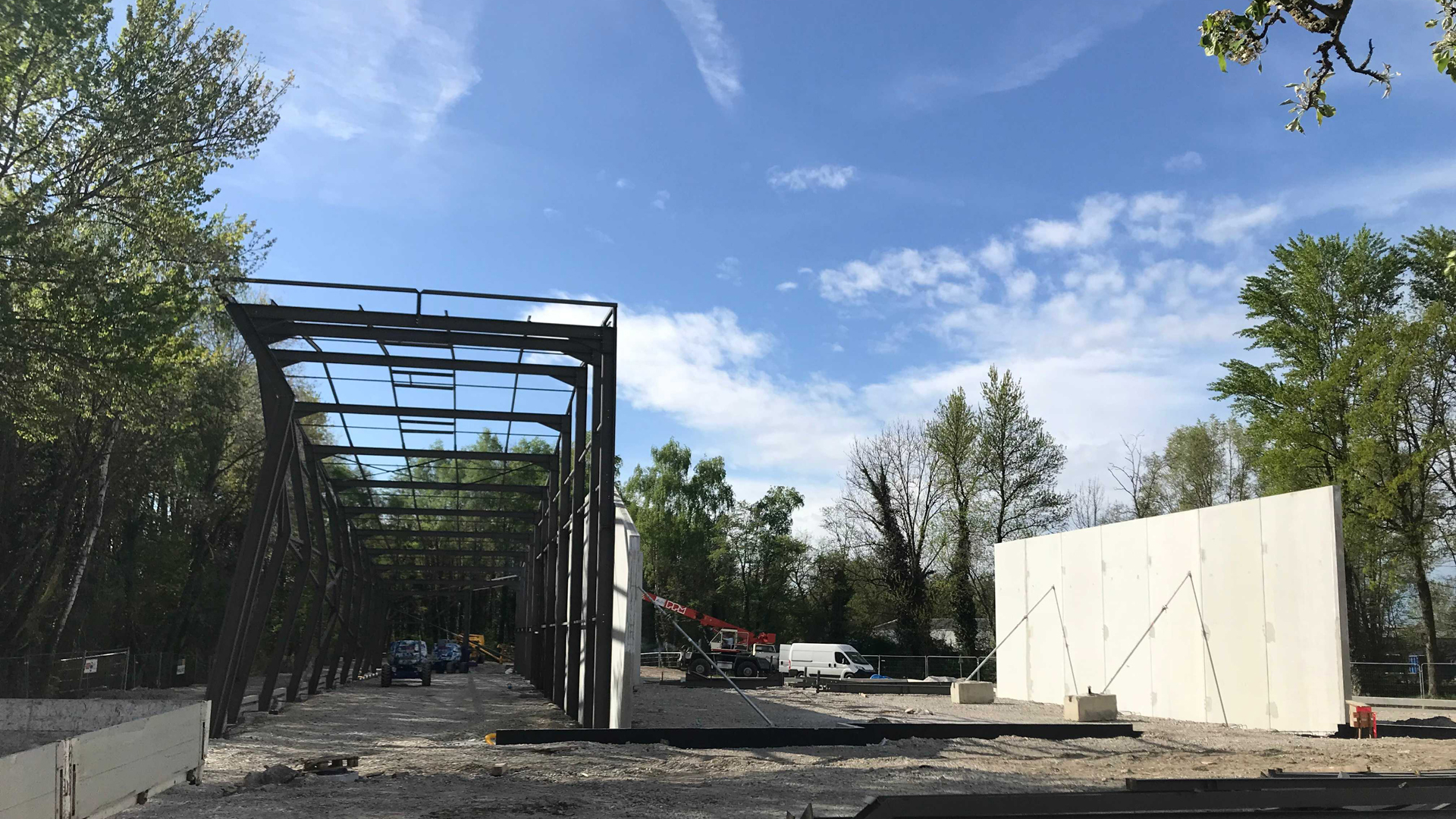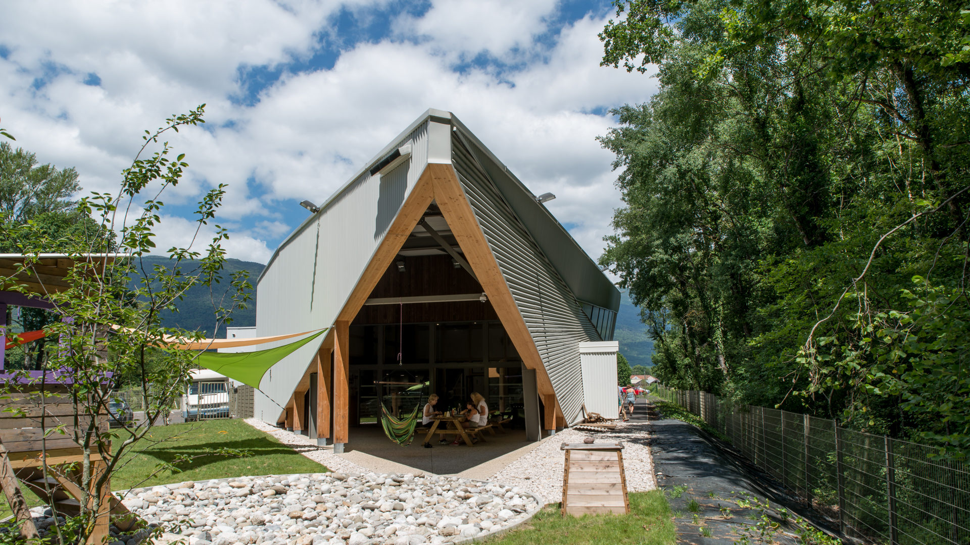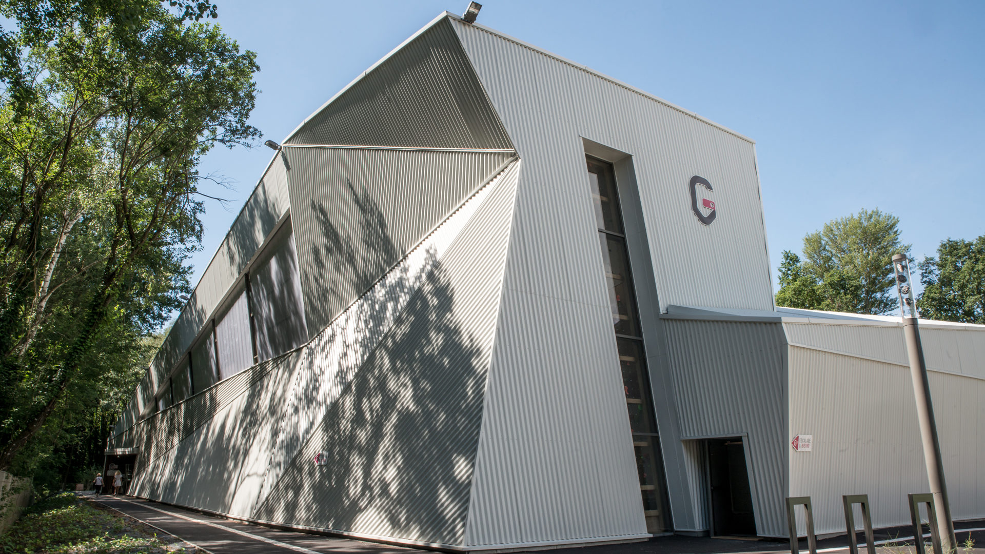 Nous avons voulu une architecture qui intègre toutes ces composantes dans un ensemble bâti homogène, répondant prioritairement aux contraintes fonctionnelles, en les utilisant comme point de départ de l’organisation d’un projet à l’architecture homogène et lisible. Le Cortigrimpe est situé dans le volume le plus haut ; cela permet l’installation des murs d’escalade de différentes hauteurs. La façade Est, traitée en creux, permet d’appuyer directement les murs de blocs sur cette forme. A l’extrémité sud, le bâtiment se termine en pointe et accueille à cet endroit une terrasse couverte.