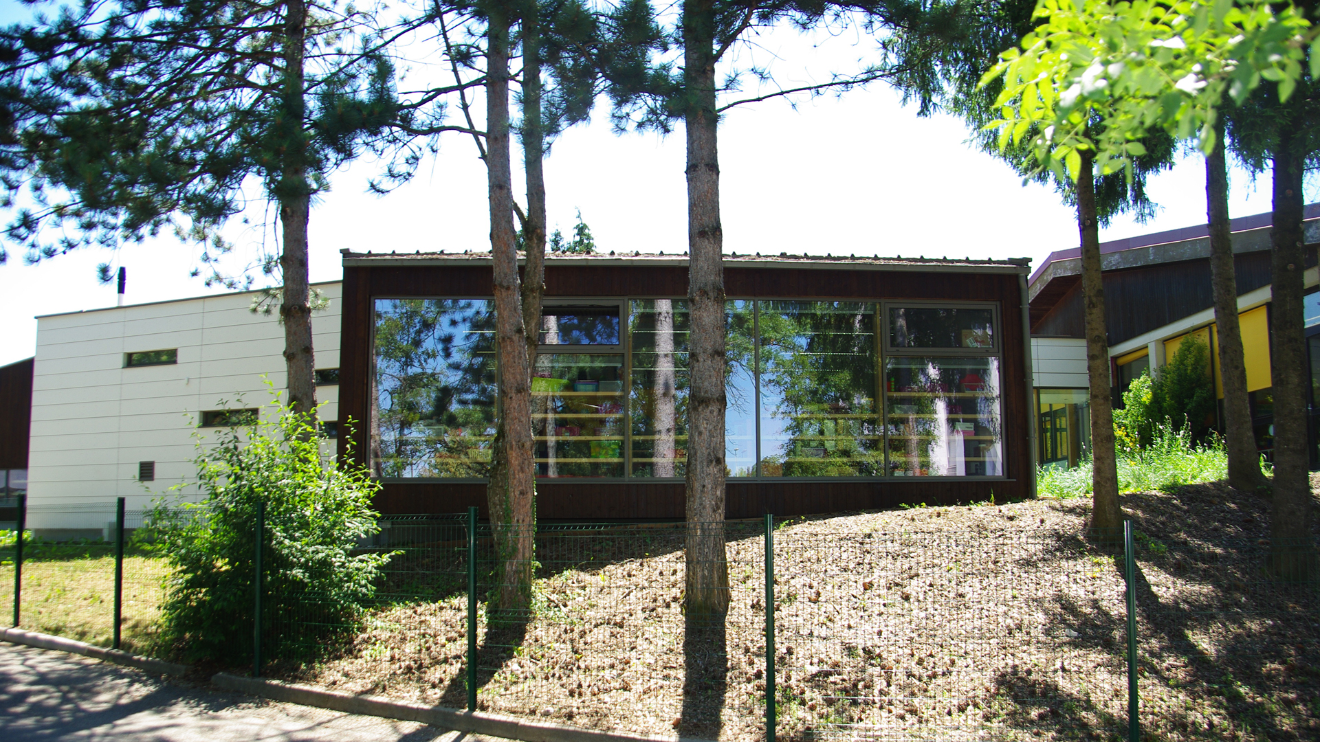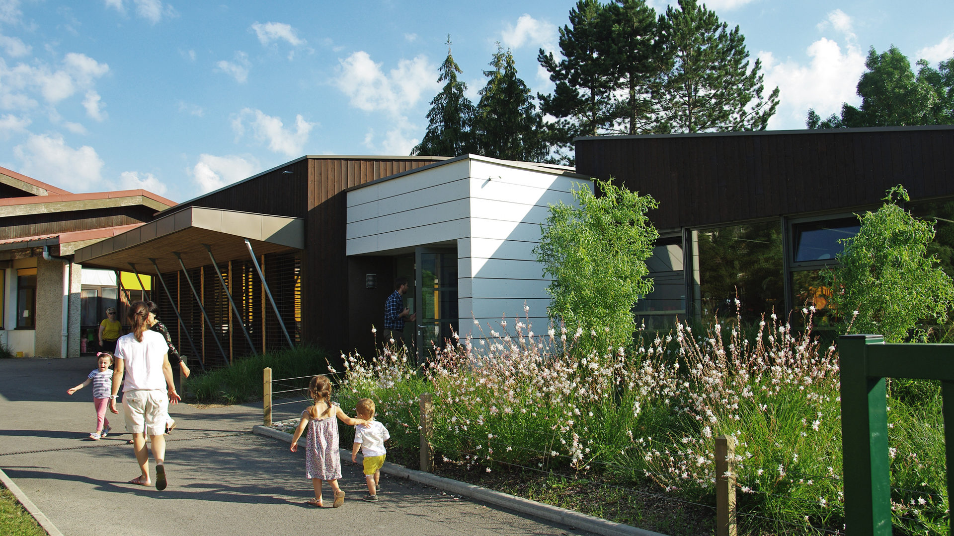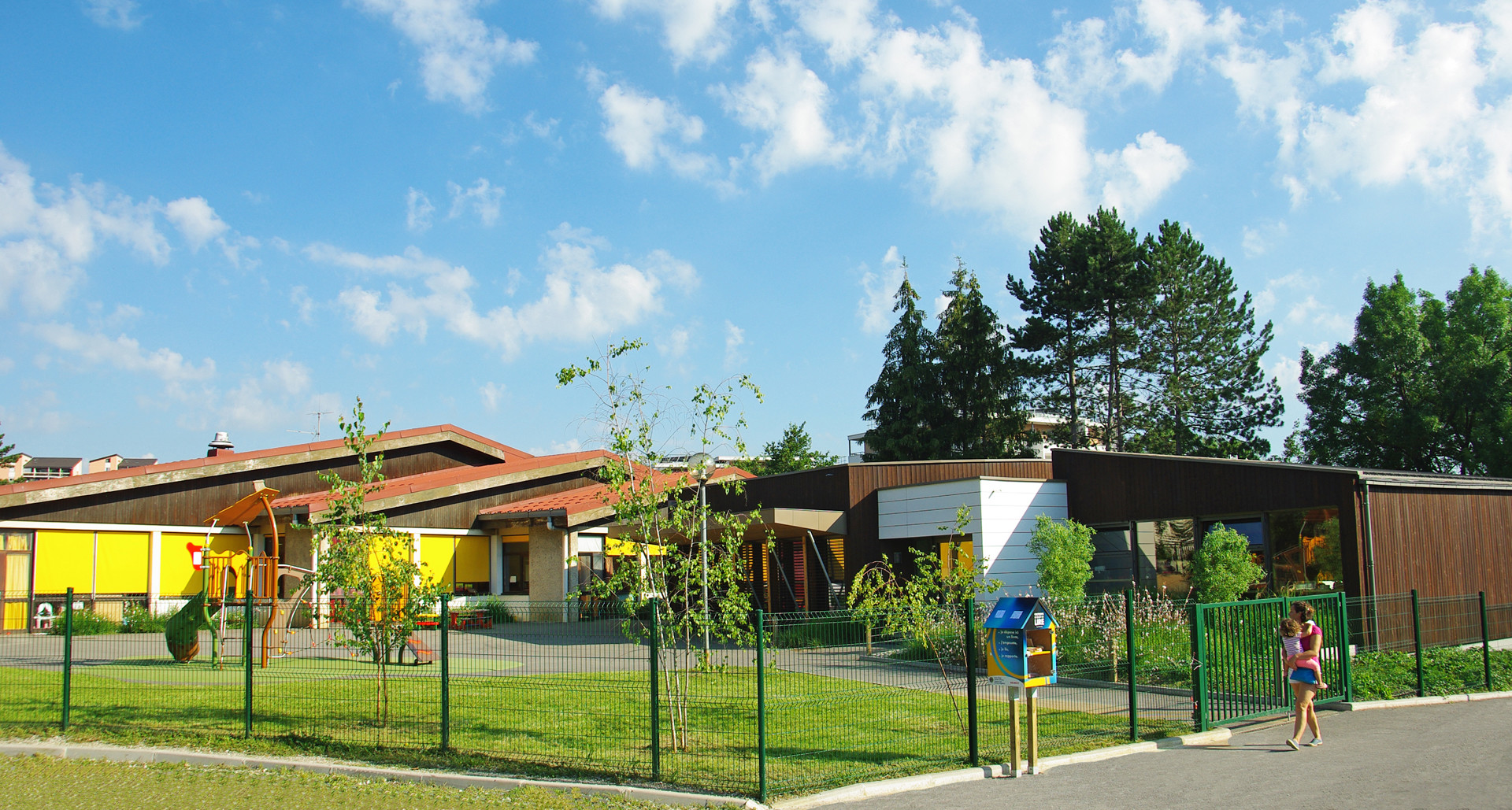 Les aménagements extérieurs ne concernent que la zone maternelle, le reste n’est pas modifié. La cour actuelle est en enrobé et pelouse, elle est bordée par plusieurs grands pins et conifères. La végétation est conservée au maximum, notamment devant les ouvertures des classes afin de servir de filtre visuel naturel ; 2 patios végétalisés sont créés entre le bâti ancien et l’extension. La volonté est de recomposer la cour en enrobé, et de concentrer la végétalisation (pelouse + arbres) sur les abords. 2 zones de jeux sont traitées en sol souple. Les abords au niveau de la clôture sont aménagés en pelouse et plantés de 3 Bouleaux en cépées et de 7 pins. Ces arbres valorisent le nouvel accès et permettent de mieux intimiser la cour par rapport à la rue Arthur Rimbaud.
