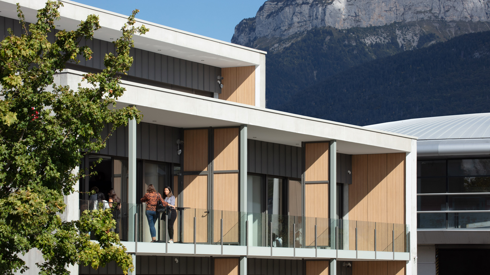 La façade principale de chacun de ces volumes cadre le paysage par une grande baie vitrée toute largeur prolongée par une terrasse ou un balcon. Cet effet de cadre est renforcé par le choix d’un materiau différent des façades, plus chaleureux, qui habille l’intérieur de ces « loggias ».