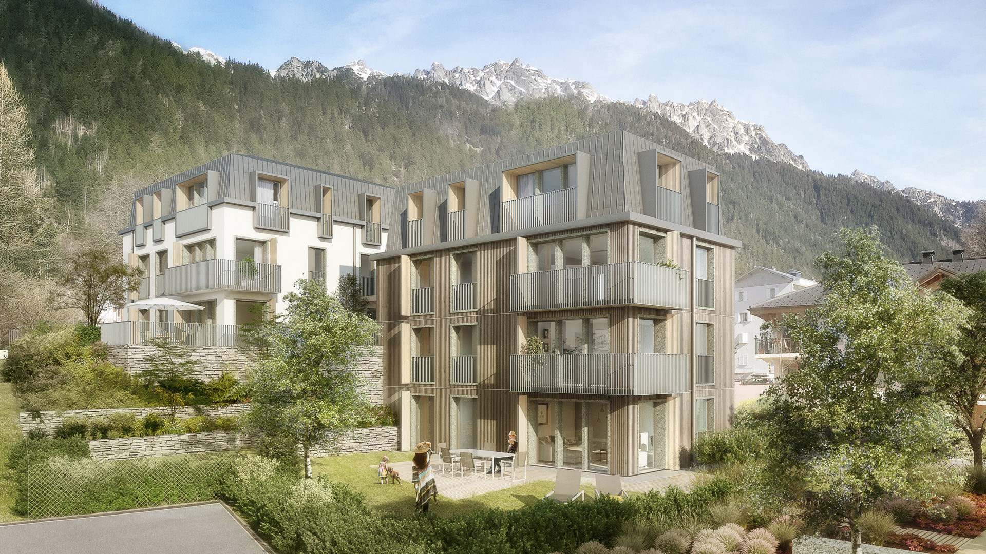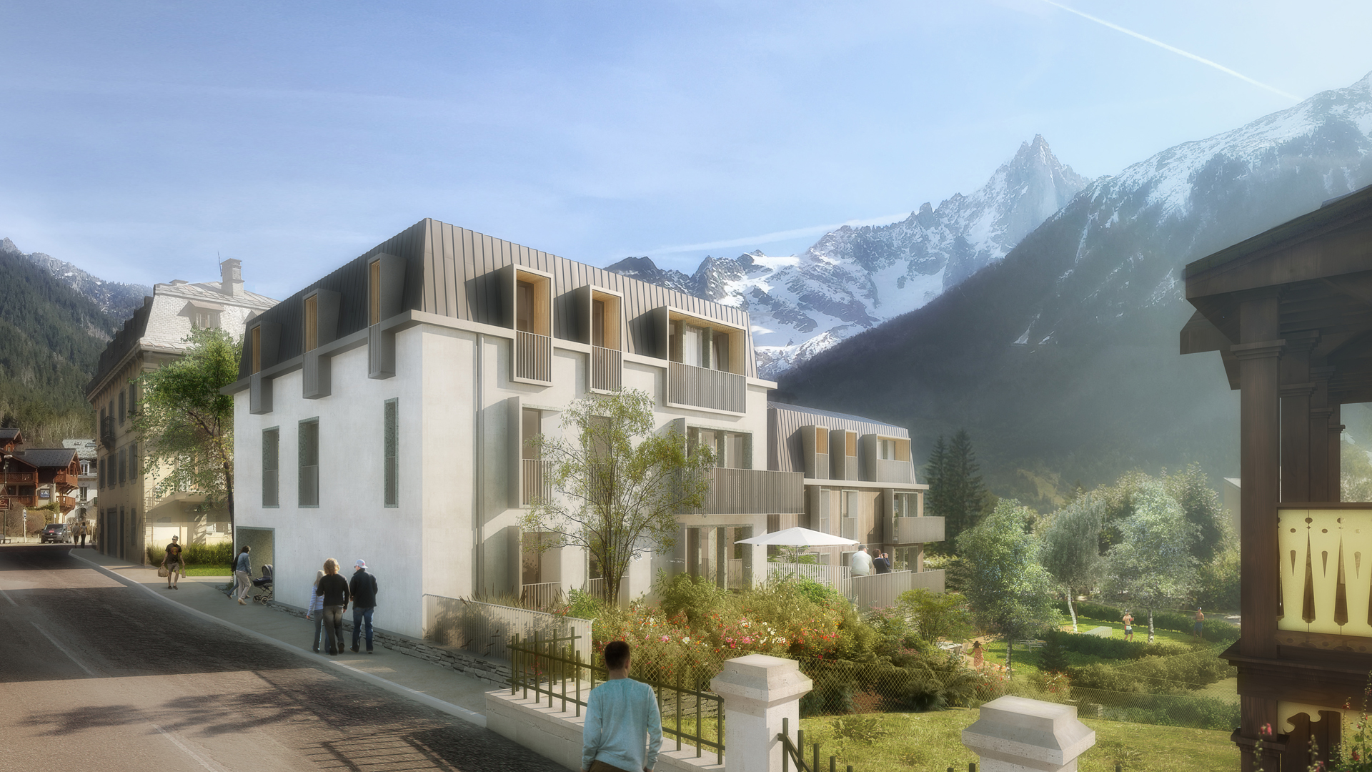 Les logements bénéficient de vastes ouvertures d’angle qui cadrent les vues sur les montagnes. Les balcons ont été volontairement réduits pour laisser, de l’intérieur, le regard toucher les aiguilles et faire entrer la lumière au cœur des logements. Nous avons apporté un soin particulier au traitement du paysage immédiat. Les jardins en cascade depuis la rue jusqu'au bas du terrain donnent une qualité d’intégration du projet dans la pente et un caractère intimiste et précieux à ces petits hôtels particuliers.