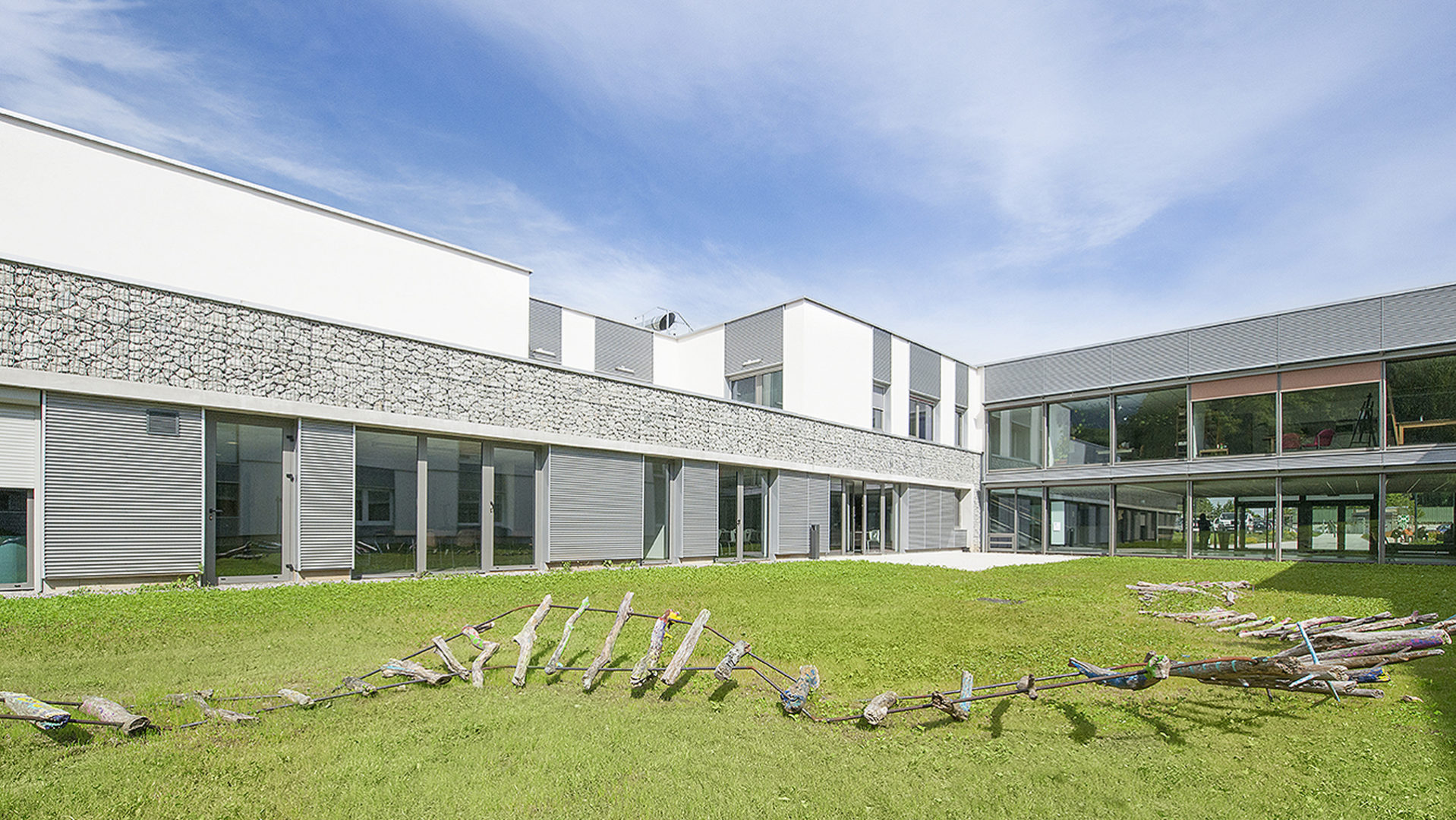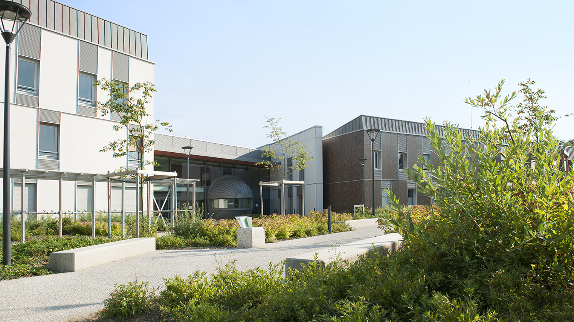 L'intégration passe par la prise en compte du site dans ses dimensions naturelles et la valorisation des qualités qui s'en dégagent : utilisation du relief pour stratifier les éléments de programme et structurer les espaces extérieurs, ouverture en façade sud des espaces de vie.