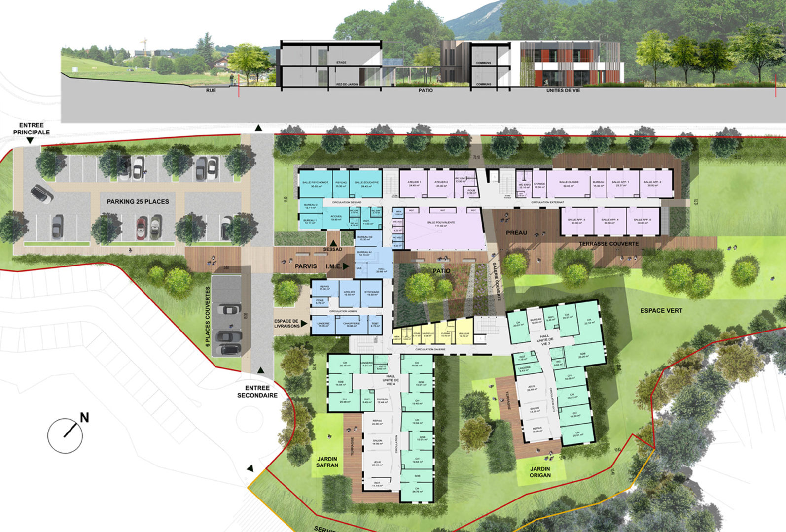 - La façade sur rue (pôle médical-SESSAD-externat) parfait son caractère plus urbain par la plantation d’arbres d’alignement qui créent un filtre végétal depuis la RD et apportent de l’ombre les fins d’après-midi estivales. Des buissons en haie vive dense ou taillés en banquette protégeront la façade de la rue.