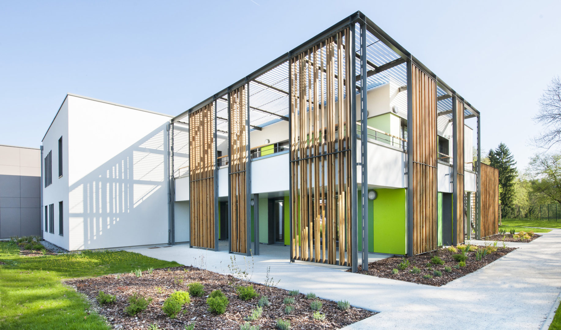 - Les abords des unités de vie sont traités comme ceux d’une villa : terrasses en béton désactivé bordées de massifs, protégées du soleil par quelques arbres.