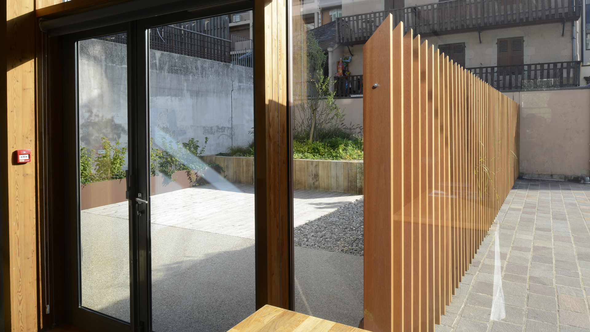 Ce jardin est situé sur une dalle parking et limite donc le projet en termes de plantations. Il est entouré sur 2 côtés par des murs qui appartiennent aux copropriétés alentours et il est donc interdit de les utiliser (fixation clôture…). Les aménagements en pavés en limite du jardin ont été réalisés par la Mairie d’Annecy et doivent être conservés.
