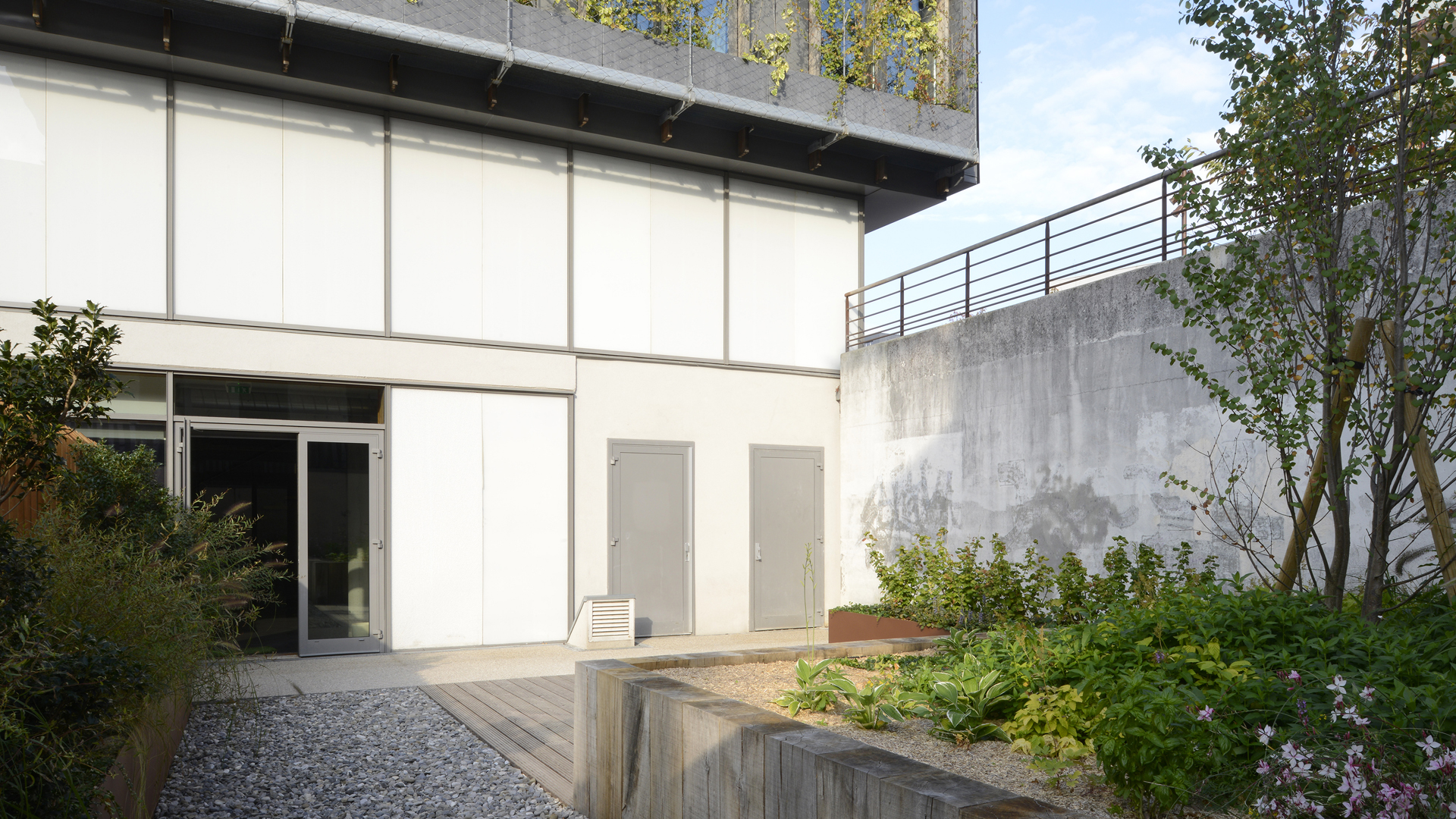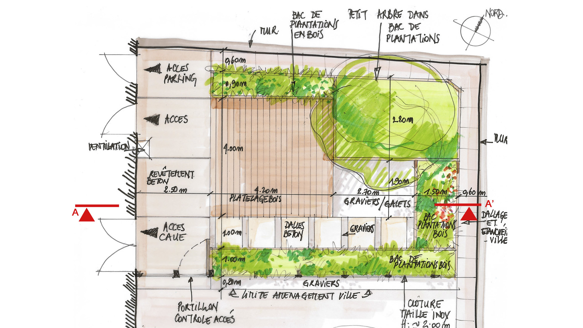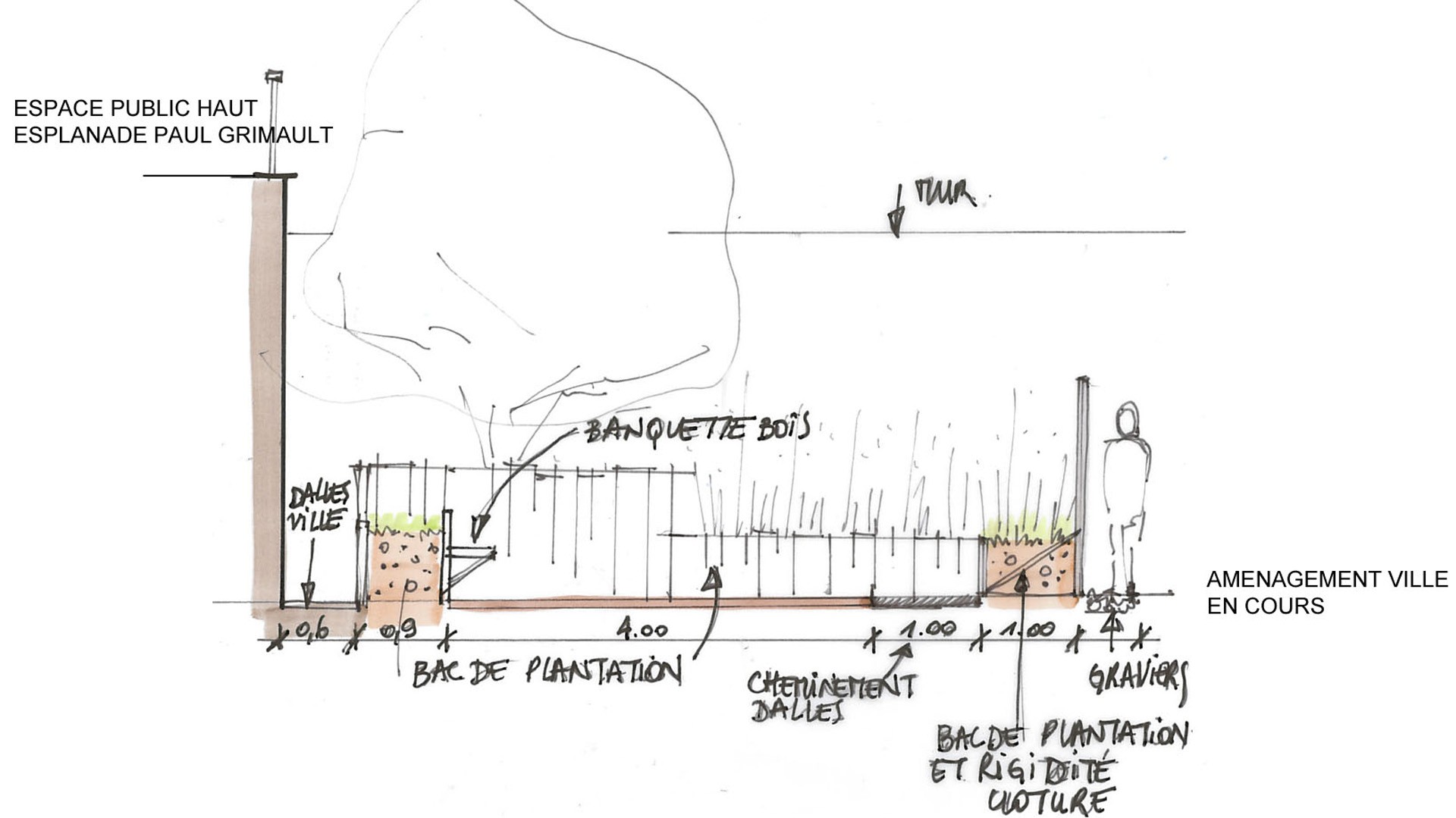 Ce jardin s’inscrit dans une trame qui se réfère à celle de la façade de RDC, et permet de dessiner un jardin « en plan » car celui-ci est visible de « dessus » depuis l’Esplanade qui se situe au niveau R+1 du bâtiment.