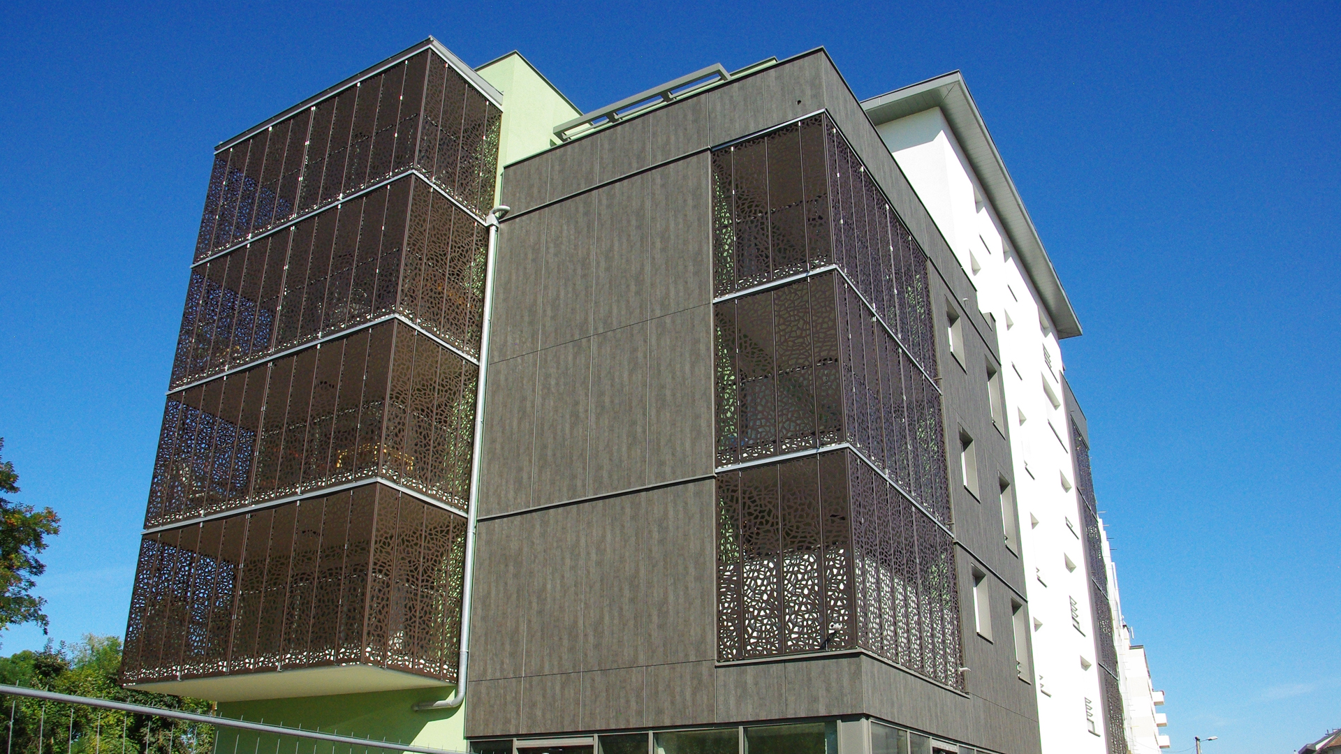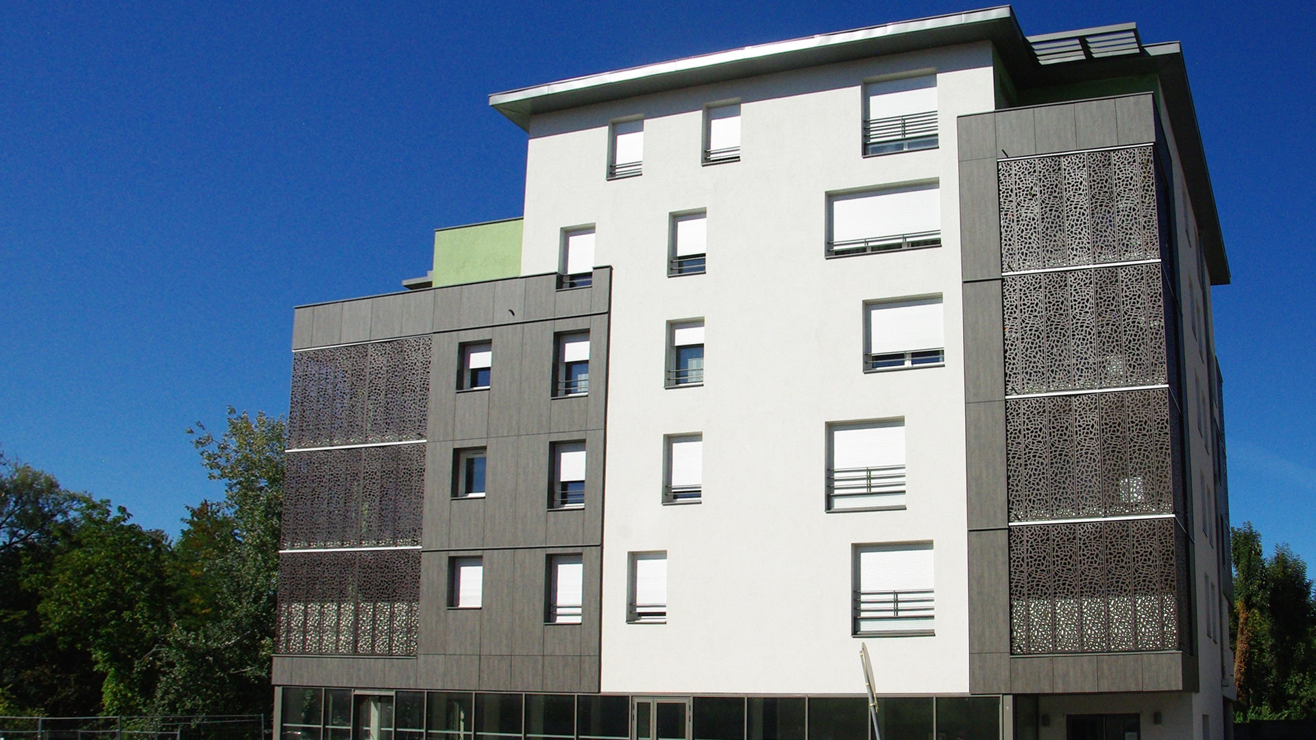 Les terrasses extrudées de ces volumes sont agrémentées de persiennes en métal ajouré permettant d’ouvrir ces espaces sur l’extérieur mais aussi de générer une intimité laissée à la libre appréciation de l’habitant.