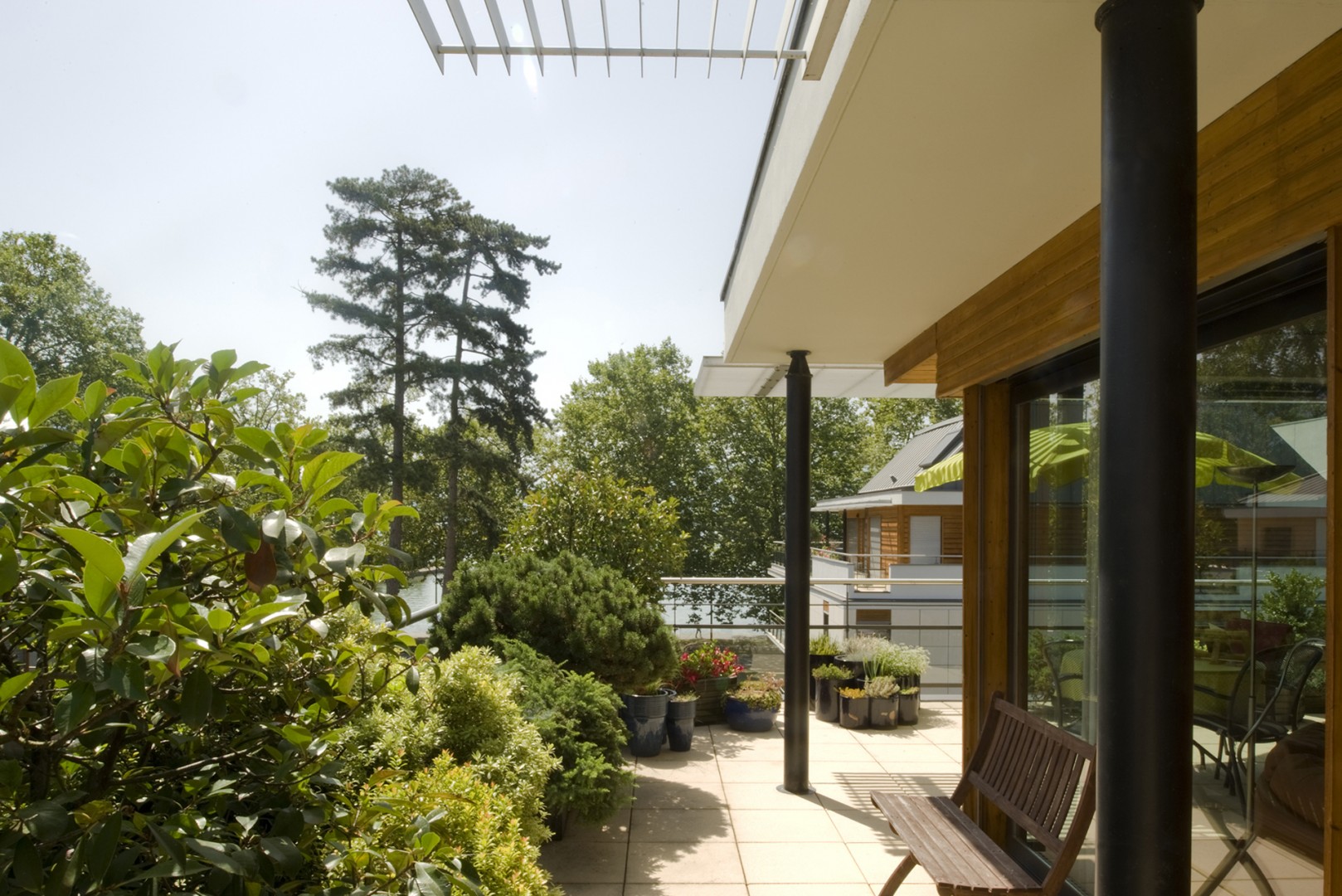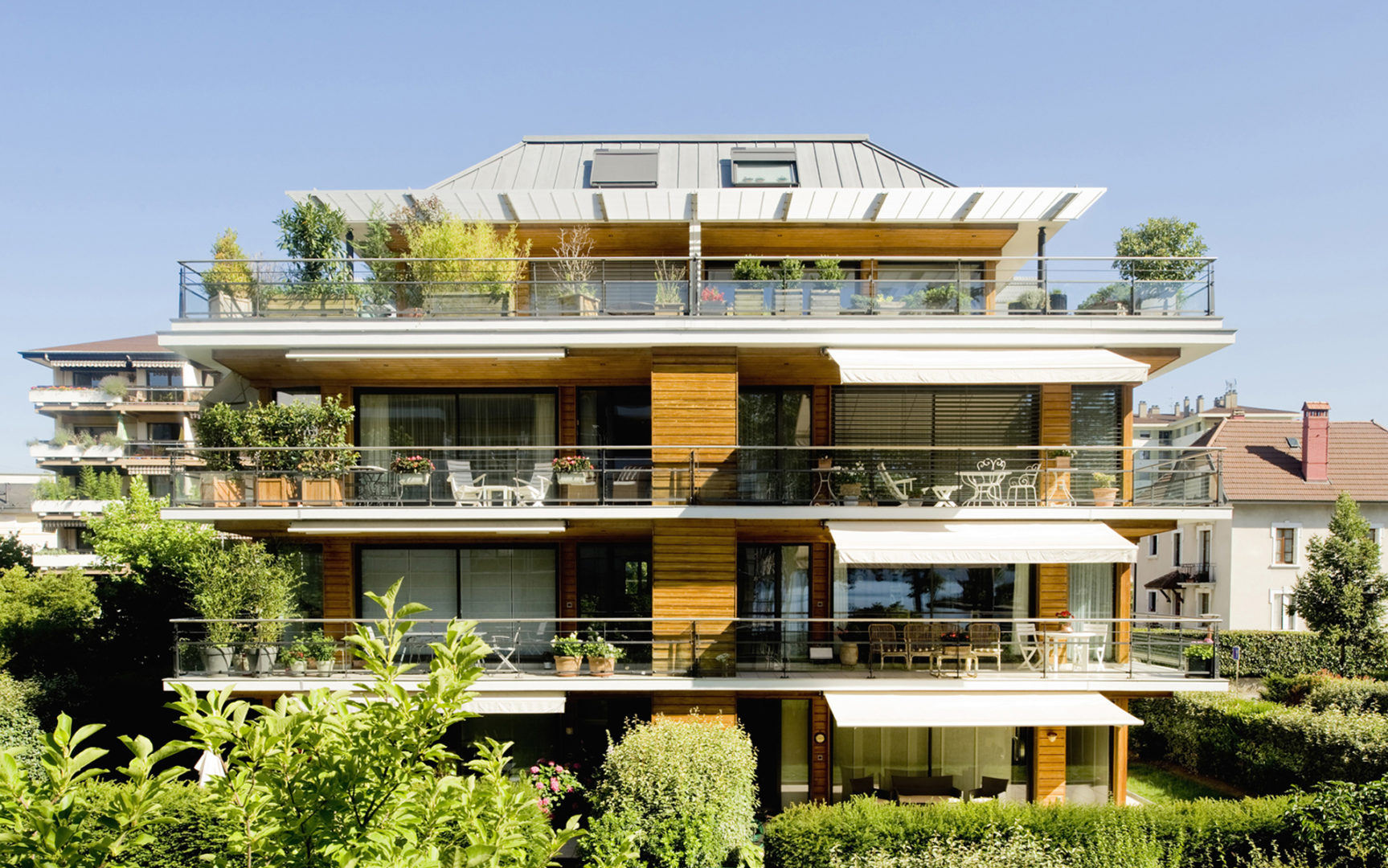 - profiter de la lumière tout en protégeant du soleil et des regards : terrasses abritées, débords de balcons, brise-soleil, stores… L'architecture affirme la grande perméabilité entre intérieur et extérieur, et l'ouverture des logements sur le soleil, la lumière, les vues et bien sûr le végétal. Pierre, bois, et surtout verre, des matériaux qui font la part belle à la lumière.