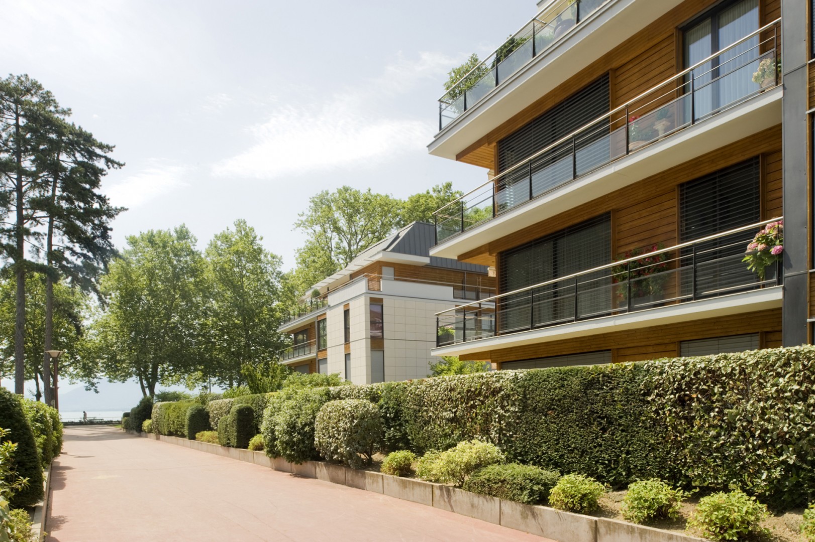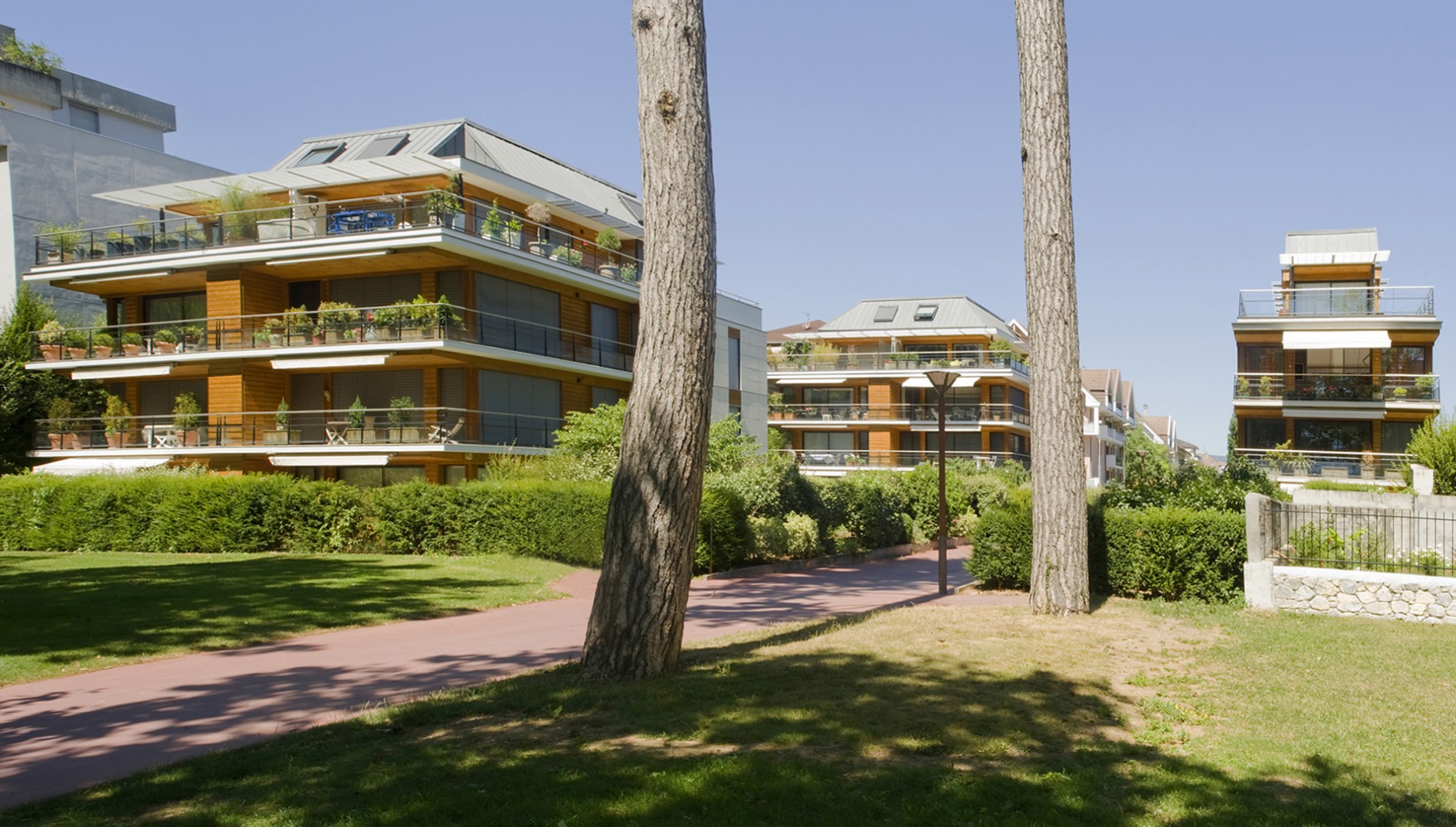 Pour profiter pleinement de ce décor d'eau et de montagnes, nous avons imaginé trois petits immeubles aux lignes très graphiques, trois épures s'ouvrant largement sur un environnement d'exception.