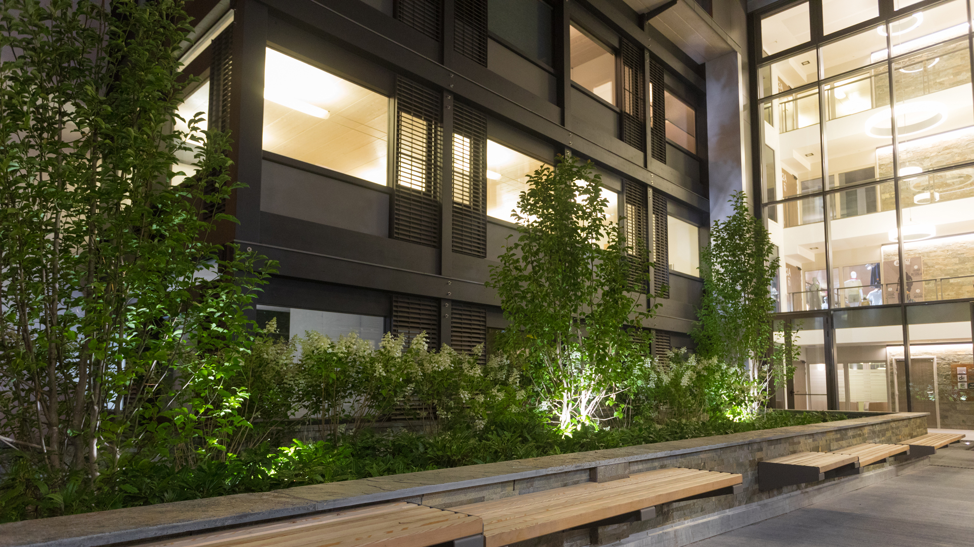 Les matériaux sont choisis et répartis afin de souligner l’architecture résolument contemporaine du projet : le verre, le béton, le bois et l’acier sont employés pour leurs qualités esthétiques et leur pérennité.