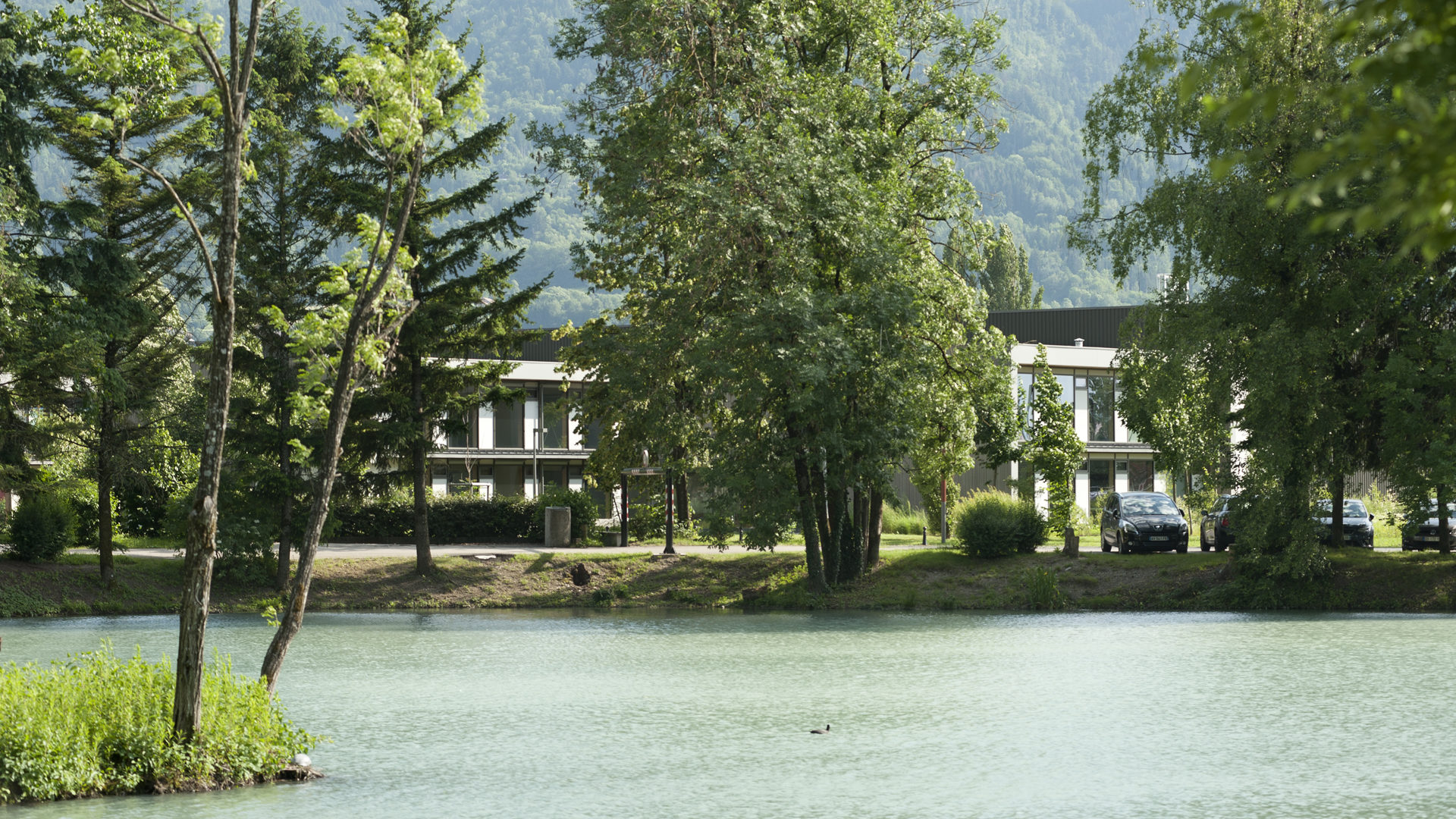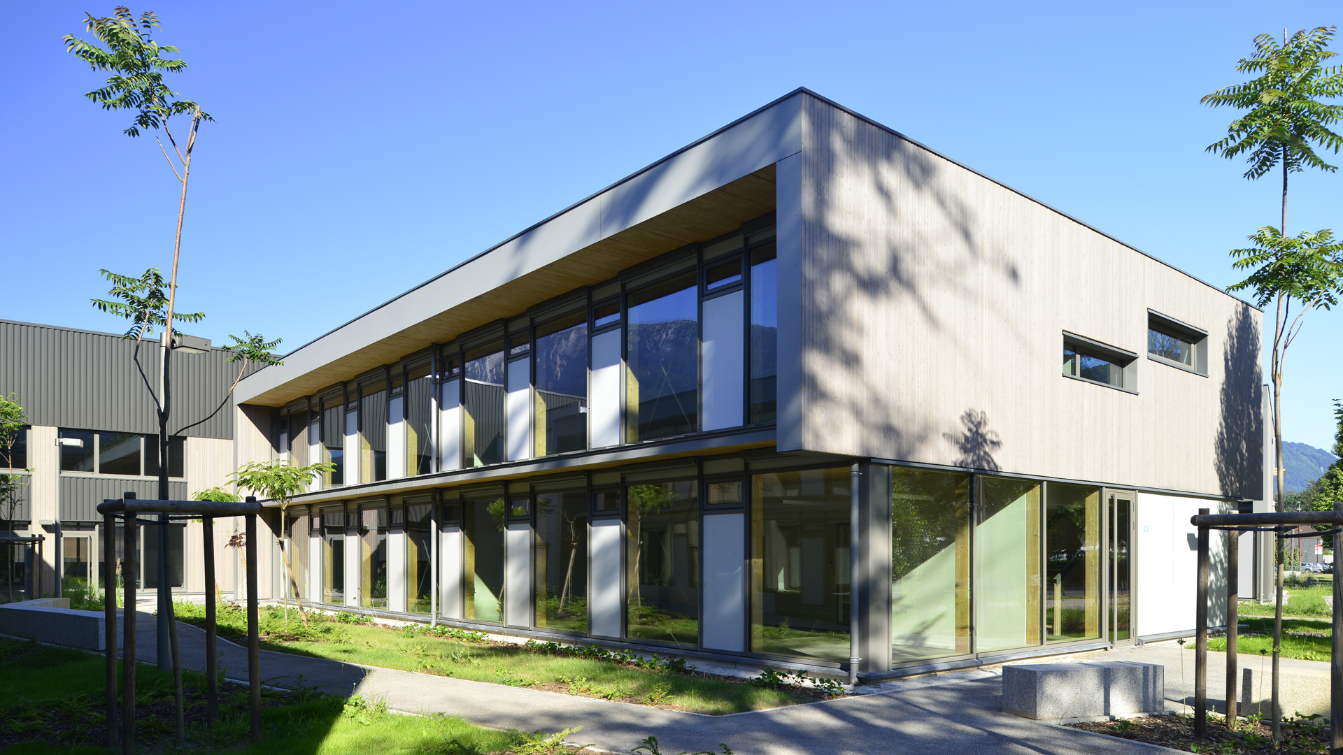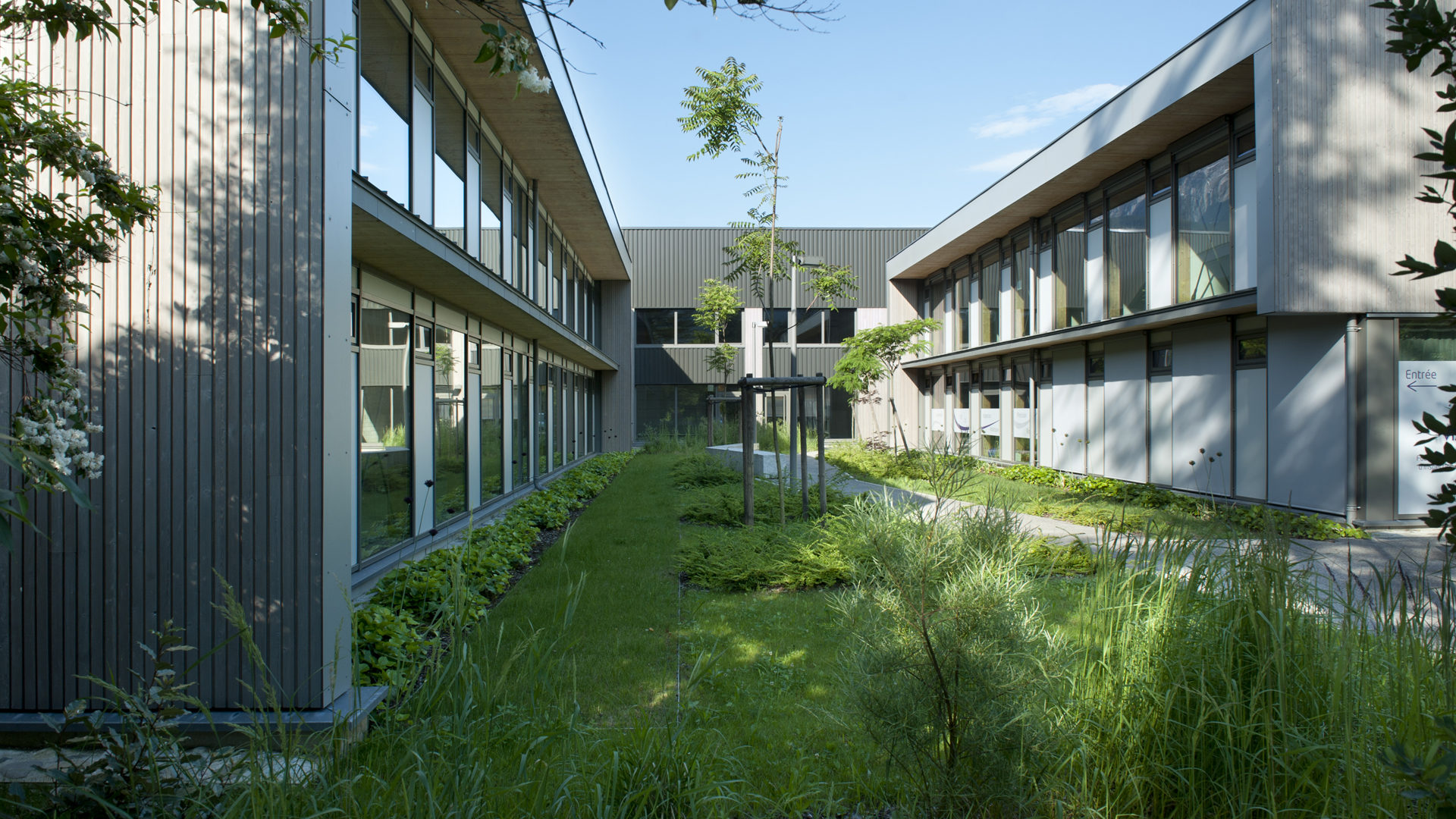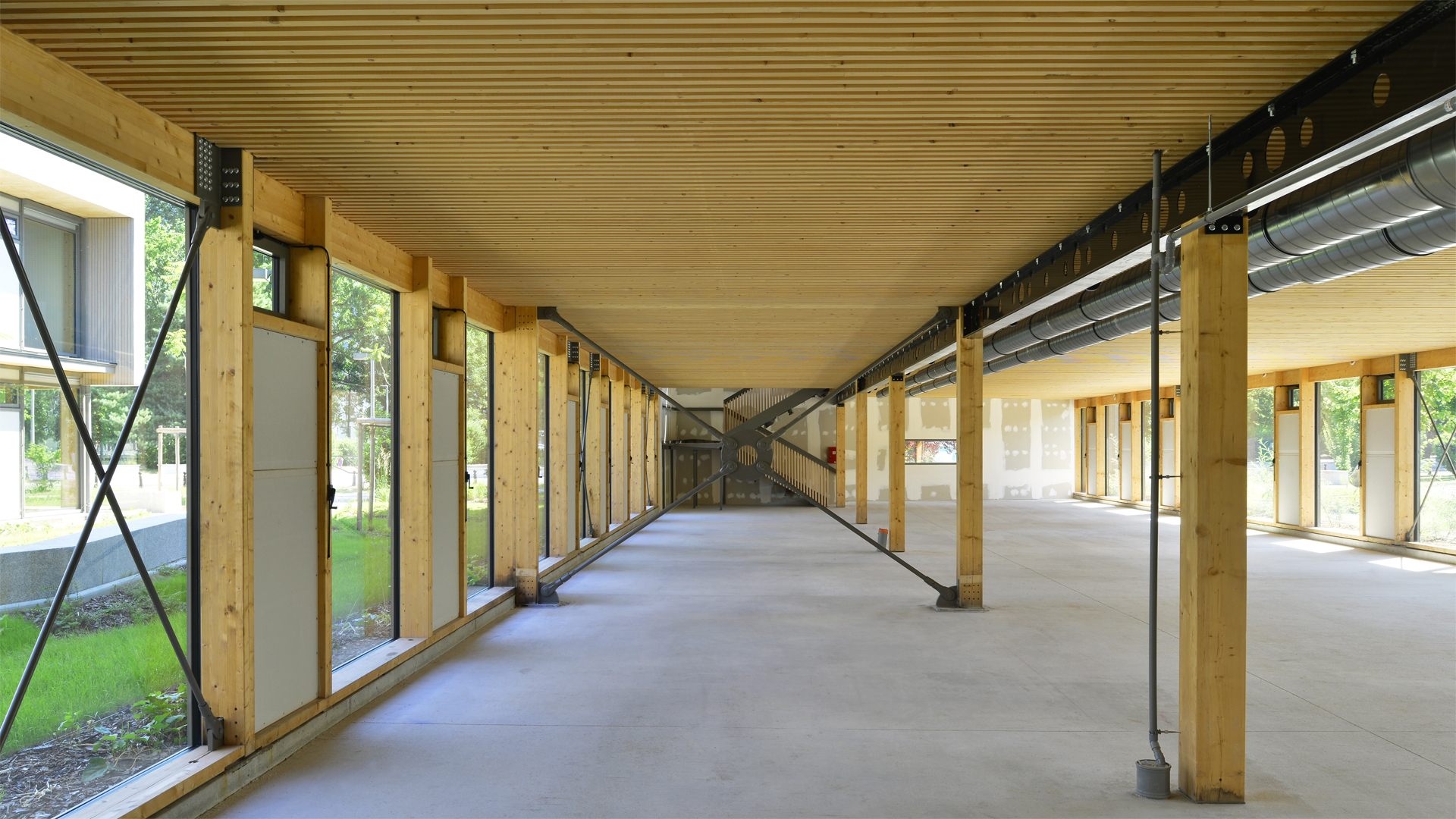 Nous avons fait le choix d’une architecture contemporaine en bois. Utilisé en structure et en façade, il est omniprésent tant à l’extérieur qu’à l’intérieur des bâtiments et contribue à la qualité des ambiances et au confort d’usage. Les dalles bois rainurées sont laissées visibles dans les espaces de travail.