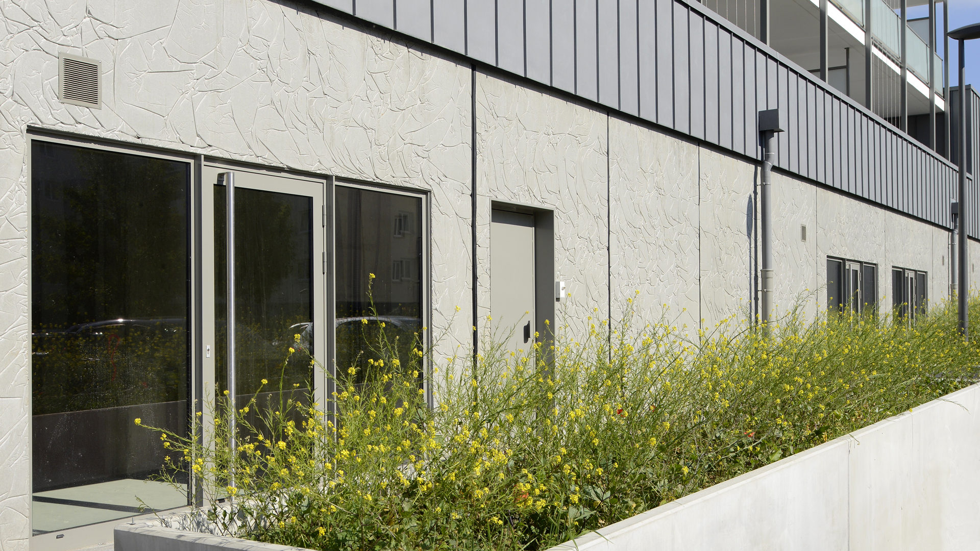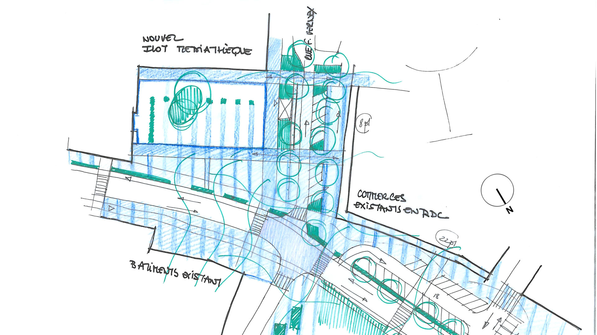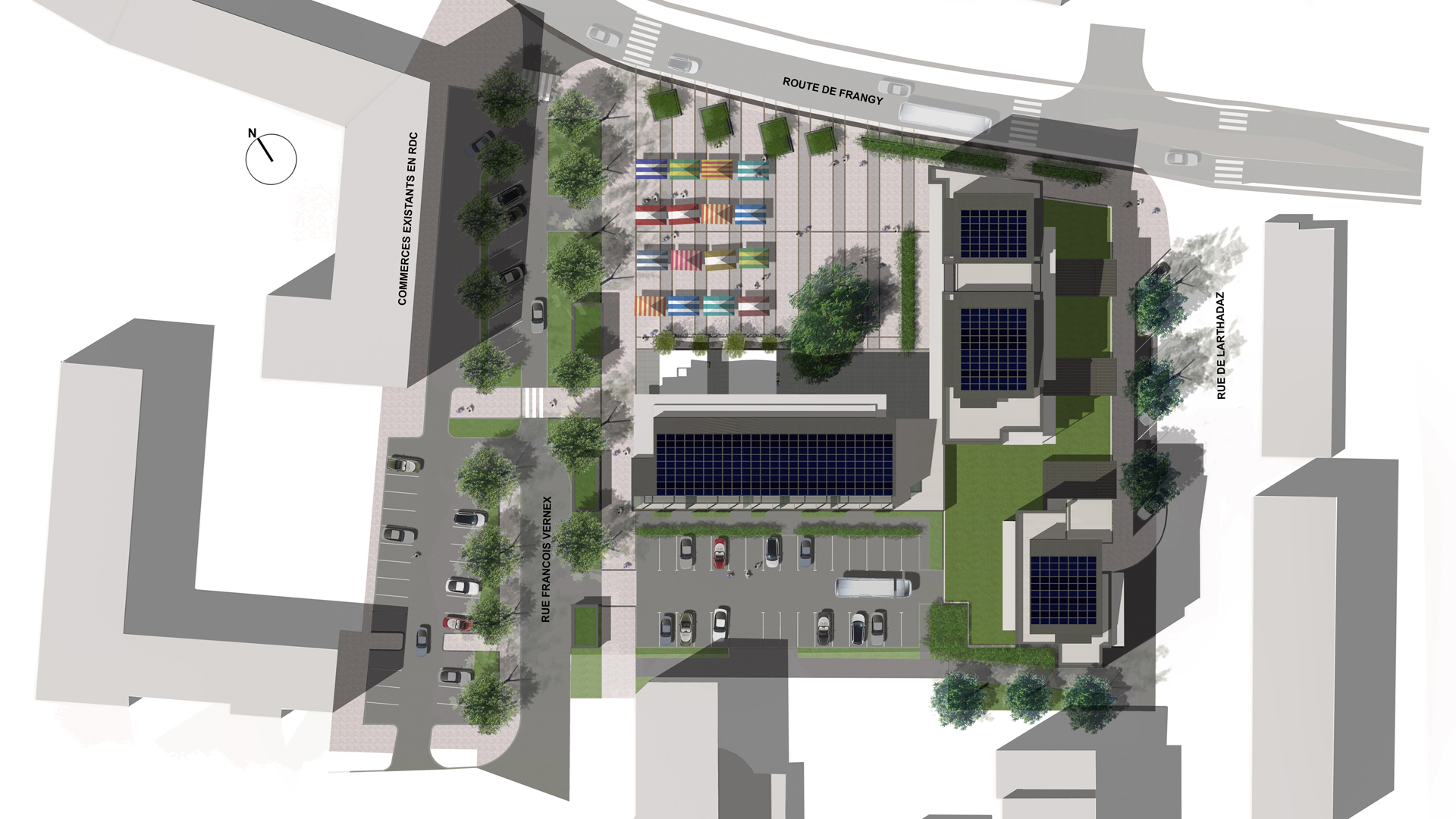 Malgré l’implantation du parking souterrain sous les bâtiments et la place, un maximum d’espace de pleine terre a été conservé pour la plantation de grands sujets. En effet, la place qui se veut plutôt minérale, met pourtant en scène quelques arbres plantés en pleine terre.