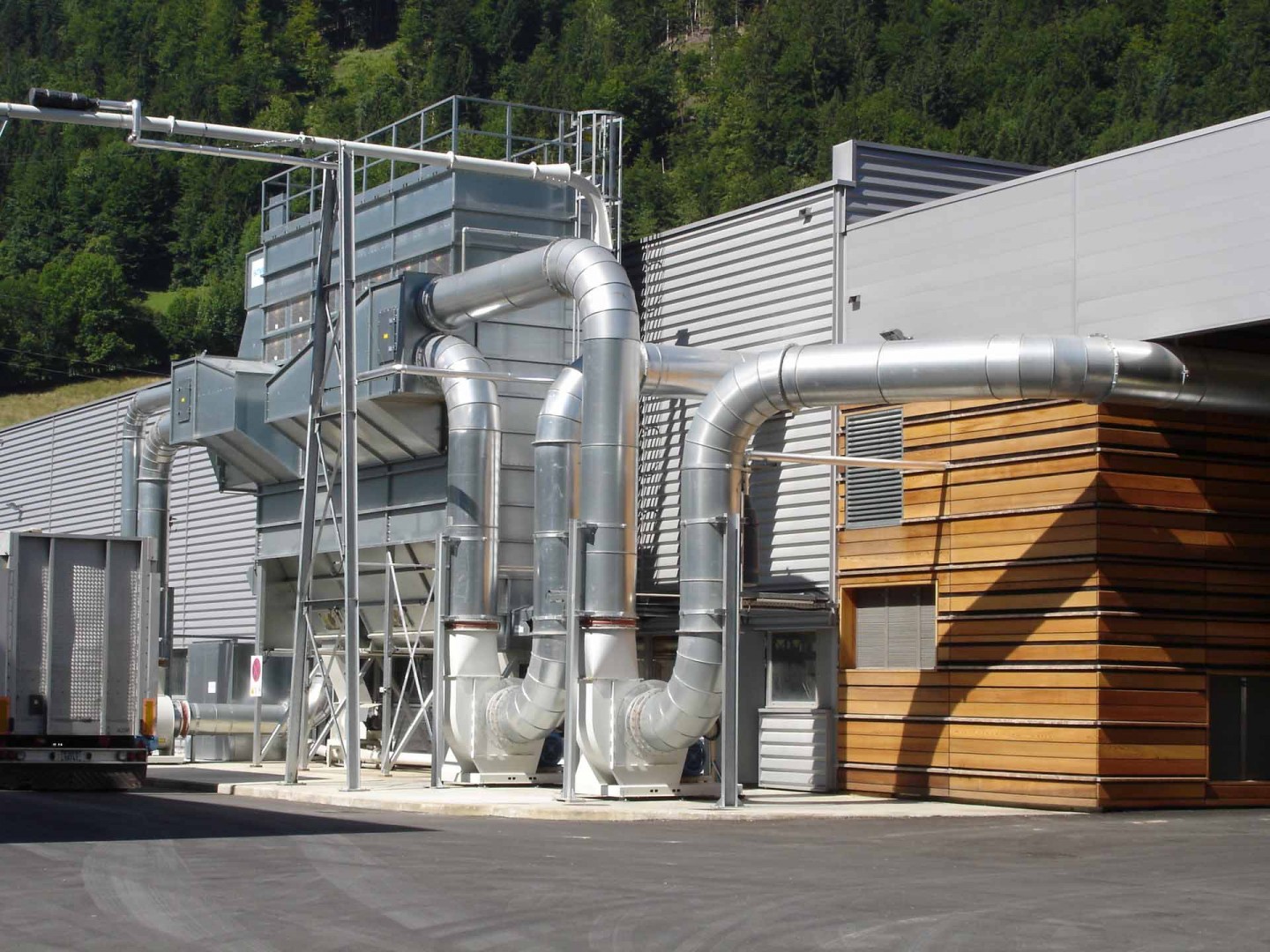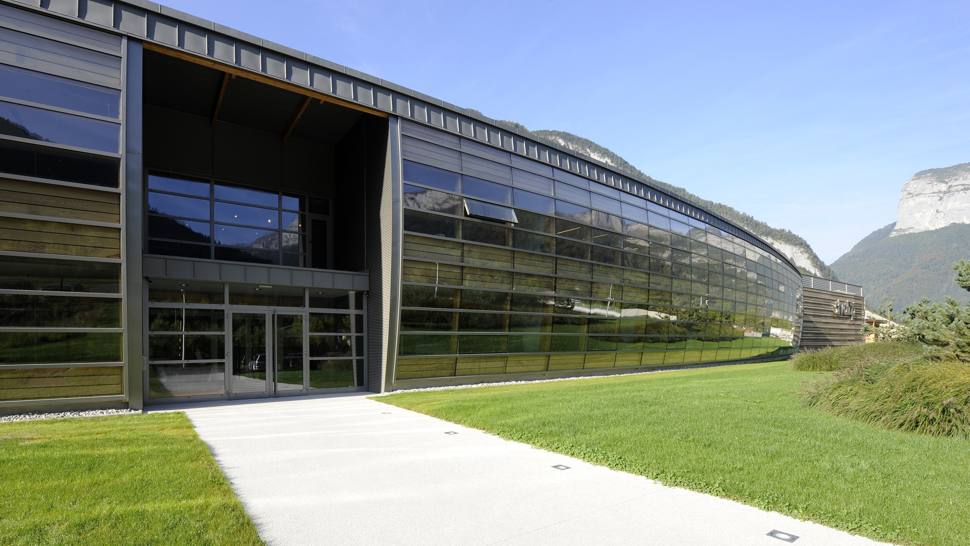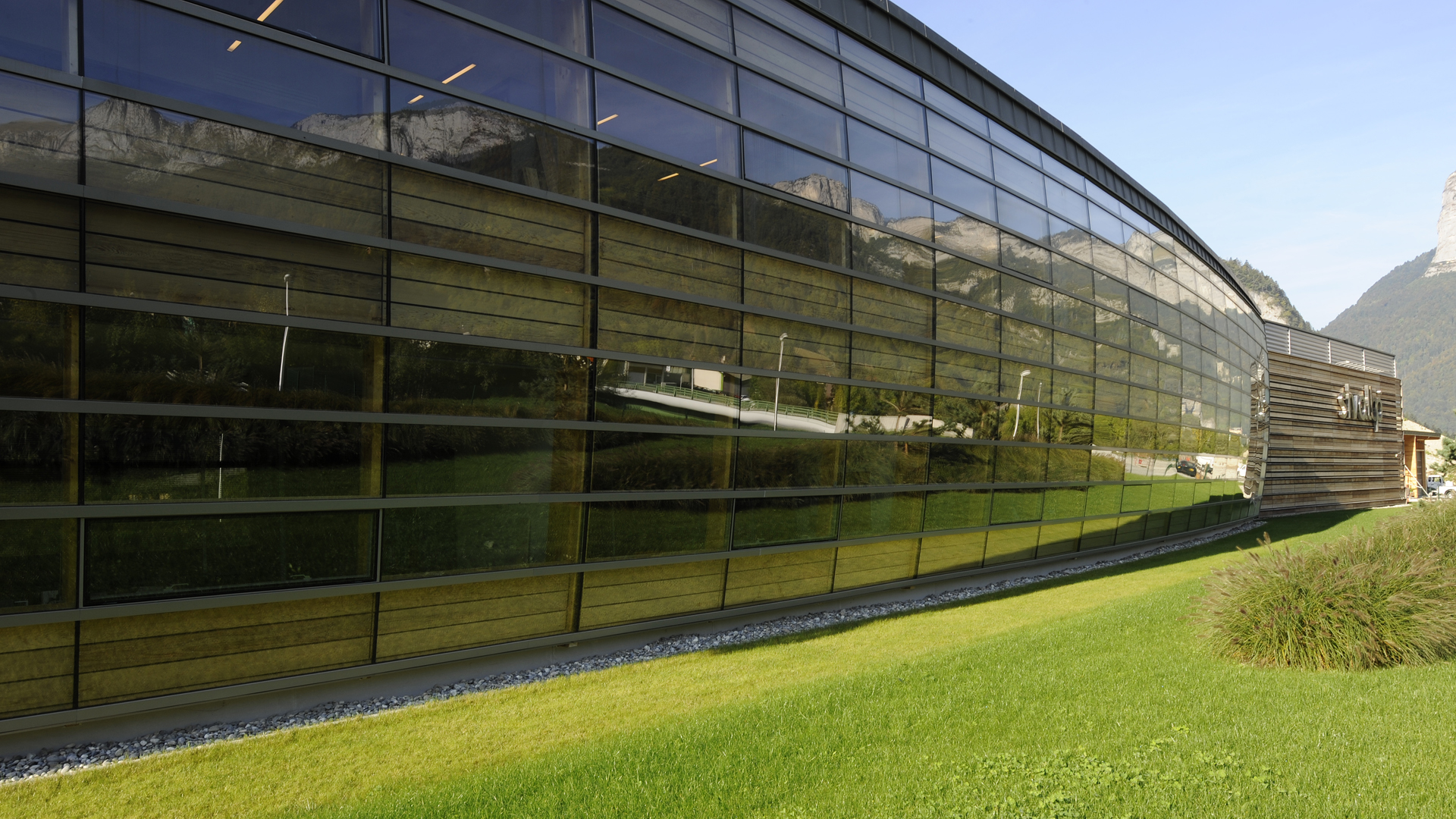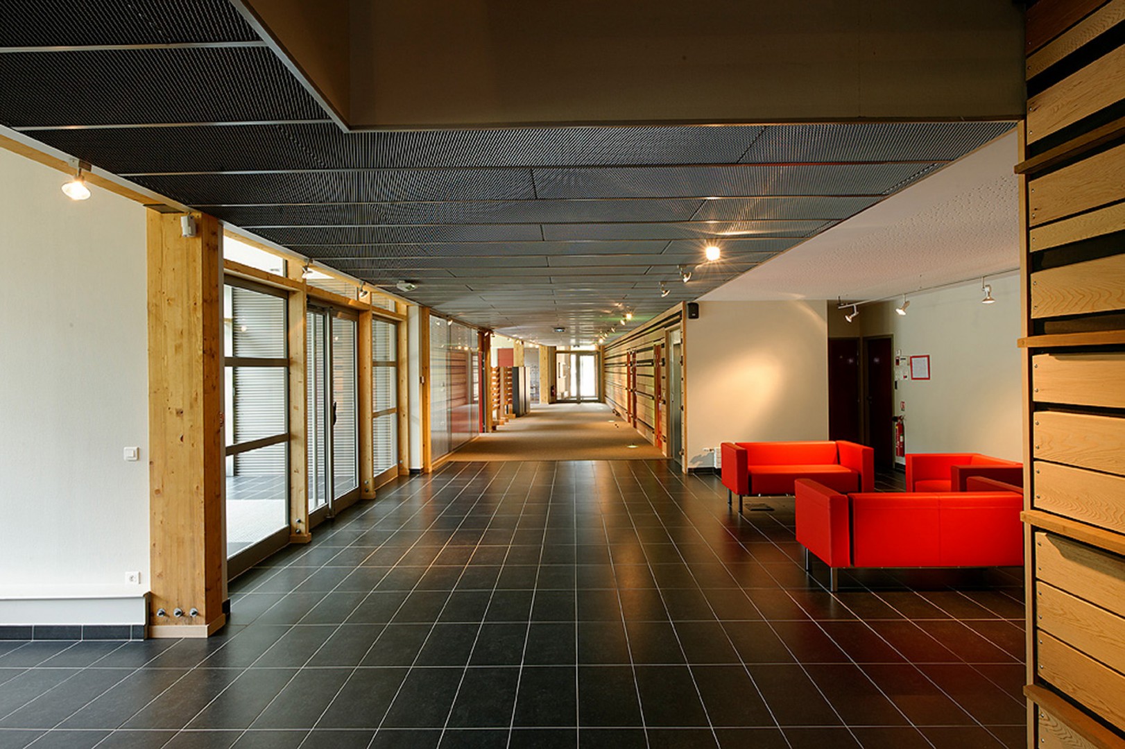 Façade orientée nord pour la régularité thermique; vitrage haute performance procédé RAICO; ventilation en double flux; traitement de la paroi froide par radiateurs filants à ailettes au pied des façades vitrées production autonome de chaleur par combustion de déchets bois. Production autonome intégrale de chaleur par la combustion des déchets de bois - chaufferie 4 Mégawatt.