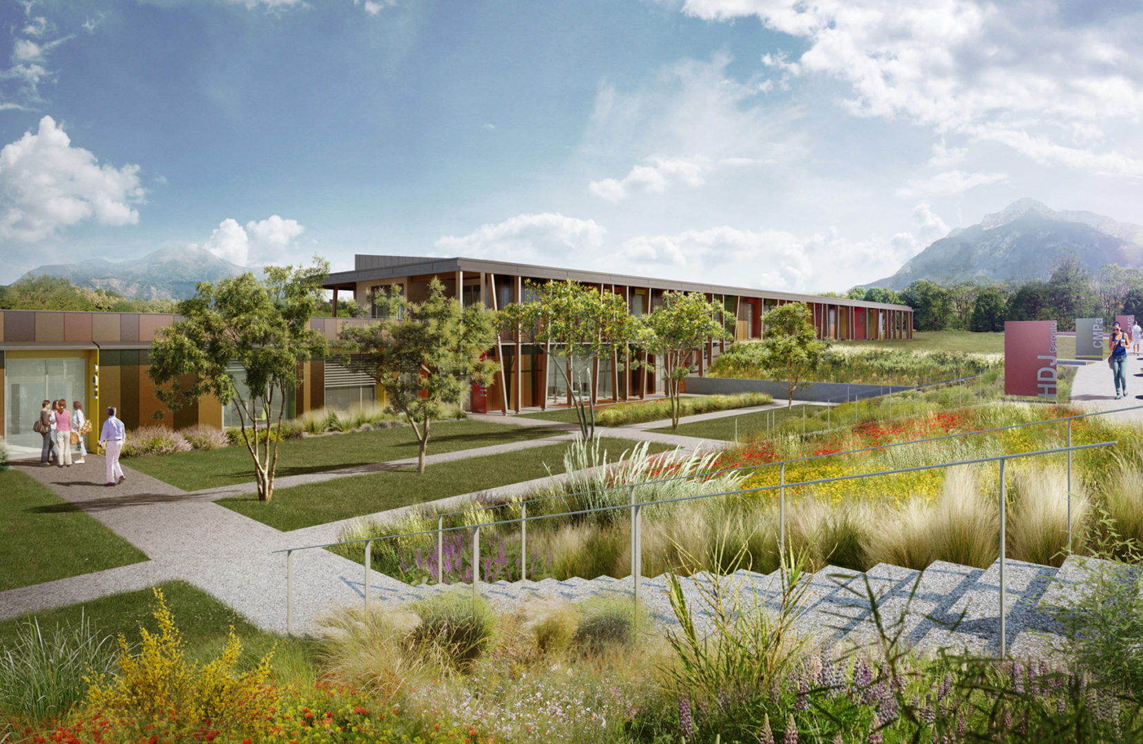 La petite échelle du projet et de ses abords permet une distinction immédiate avec l'hôpital voisin. Le choix du bois comme élément structurel du projet est mis en évidence afin d'adoucir l'effet institutionnel de l'ouvrage et de le lier de manière plus intime à son environnement végétal.