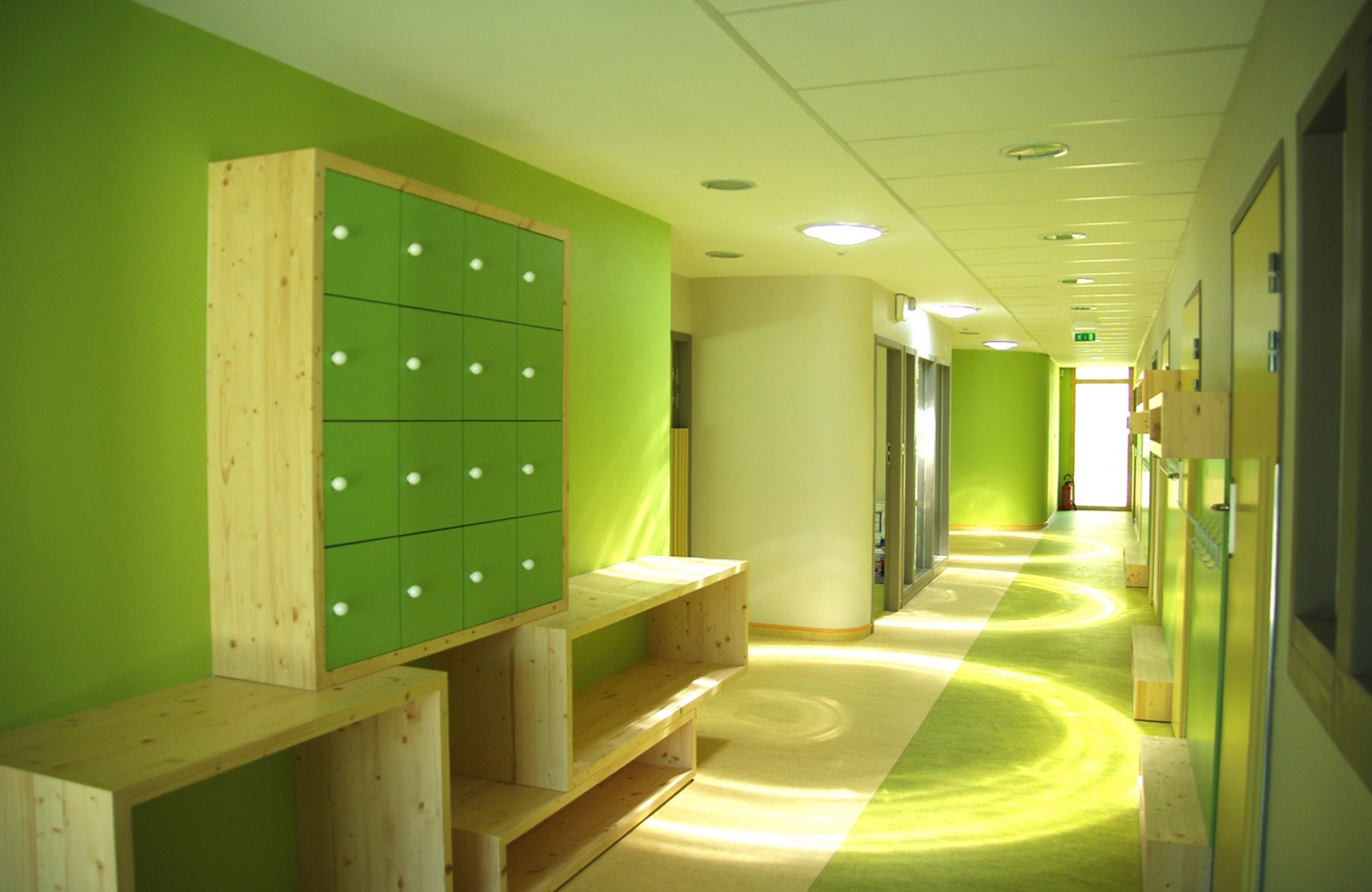 Le parti-pris est d'organiser les espaces le long d'un axe de circulation principal, généreux et lumineux. Cette allée intérieure dessert au Nord une zone technique et au Sud les espaces de vie des enfants qui bénéficient d'un maximum de lumière naturelle.